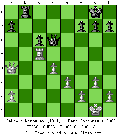 Last move : 1-0 2008 December 30 18:33:14 [Event "FICGS__CHESS__CLASS_C__000103"] [Site "FICGS"] [Date "2008.12.23"] [Round "1"] [White "Rakovic,Miroslav"] [Black "Farr,Johannes"] [Result "1-0"] [WhiteElo "1901"] [BlackElo "1600"] 1.c4 e6 2.Nc3 d5 3.g3 Nf6 4.Bg2 c5 5.cxd5 exd5 6.d3 Nc6 7.Bg5 Be6 8.Nh3 Be7 9.Bxf6 Bxf6 10.Nf4 Qa5 11.O-O Bxc3 12.bxc3 Qxc3 13.Nxd5 Bxd5 14.Bxd5 Qf6 15.Qa4 O-O 16.Bxc6 bxc6 17.Rac1 Rfe8 18.Rc2 Re5 19.Rfc1 Qe6 20.e3 Rb8 21.Rxc5 Rxc5 22.Rxc5 Qd6 23.d4 1-0 English Opening Kingside Castling by player White (move 11) Kingside Castling by player Black (move 15) Player White won this chess game. Follow this game move after move (download)No one ever won a game by resigning. (Unknown) Ich verstehe den Grund nicht, warum die Aufteilung in Frauen und Männer überhaupt im Schach besteht. (Judith Polgar) Fischer deseaba darle a los Rusos una sopa de su propia medicina. (Larry Evans) Le génie consiste à savoir transgresser les règles au moment opportun. (Teichmann) Waiting for chance ? Play in casinos. (FICGS proverb)