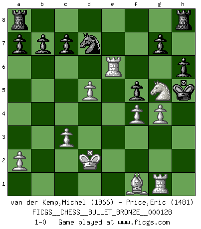Last move : 1-0 2009 June 24 0:6:56 [Event "FICGS__CHESS__BULLET_BRONZE__000128"] [Site "FICGS"] [Date "2009.06.23"] [Round "1"] [White "van der Kemp,Michel"] [Black "Price,Eric"] [Result "1-0"] [WhiteElo "1966"] [BlackElo "1481"] 1.e4 e5 2.f4 d5 3.exd5 e4 4.d3 Nf6 5.dxe4 Nxe4 6.Nf3 Bc5 7.Qe2 Bf5 8.Nc3 Qe7 9.Be3 Bxe3 10.Qxe3 Nxc3 11.Qxe7+ Kxe7 12.bxc3 Be4 13.Ng5 Bxc2 14.Kd2 Bf5 15.Re1+ Kf6 16.g4 Bxg4 17.Ne4+ Kg6 18.Rg1 f5 19.Ng5 h6 20.Re6+ Kh5 21.h3 Nd7 22.hxg4+ 1-0 KGD : Falkbeer, Main line, 7...Bf5 Player White won this chess game. Follow this game move after move (download)Only the player with the initiative has the right to attack. (Wilhelm Steinitz) Mit sehr nachdenklichem Gesicht schreitet Bobby durch den Turniersaal. Was ist passiert?, fragt Lombardy. Ich stehe schlecht, antwortet Fischer. Lombardy: Dann biete doch einfach Remis an. Fischer: So schlecht stehe ich nun auch wieder nicht! (Robert James Fischer) Tu sabes, camarada Pachman, no disfruto el ser un Ministro, preferería jugar al Ajedrez como tu. (Che Guevara) Les Cavaliers se révèlent fort utiles dans les positions fermées. D'habitude, les Fous sont un peu plus forts que les Cavaliers dans les positions ouvertes. Qu'on le veuille ou non, il restera toujours des exceptions ! I feel so... helpless. (C-3PO in Star Wars ep.3)