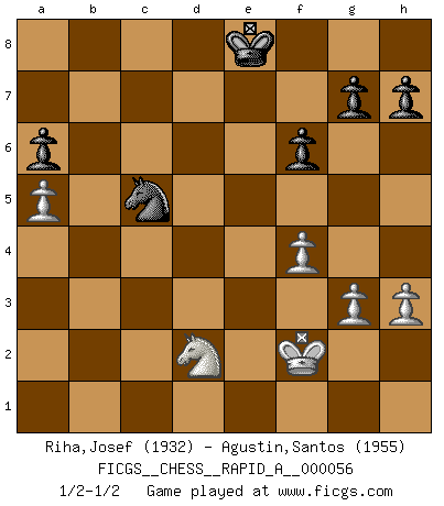 Last move : 1/2-1/2 2009 March 19 11:20:40 [Event "FICGS__CHESS__RAPID_A__000056"] [Site "FICGS"] [Date "2008.12.26"] [Round "1"] [White "Riha,Josef"] [Black "Agustin,Santos"] [Result "1/2-1/2"] [WhiteElo "1932"] [BlackElo "1955"] 1.c4 c6 2.e4 d6 3.Nc3 d5 4.cxd5 Nf6 5.Nf3 cxd5 6.exd5 Nxd5 7.Bb5+ Bd7 8.Qb3 Nb6 9.d4 e6 10.d5 exd5 11.O-O Nc6 12.a4 Na5 13.Qa2 Bb4 14.Re1+ Kf8 15.Bxd7 Qxd7 16.Rd1 Bxc3 17.Qa3+ Kg8 18.Qxc3 Nc6 19.a5 Nc8 20.b4 a6 21.Be3 f6 22.Bc5 N8e7 23.h3 Kf7 24.Rd3 Rhd8 25.Qd2 Kg8 26.Re1 Ng6 27.Rd1 Qf7 28.Rxd5 Rxd5 29.Qxd5 Qxd5 30.Rxd5 Rd8 31.Rxd8+ Nxd8 32.Nd4 Kf7 33.b5 Ne6 34.bxa6 bxa6 35.Nb3 Ke8 36.g3 Ne5 37.f4 Nf3+ 38.Kf2 Nd2 39.Nxd2 Nxc5 1/2-1/2 English : Caro-Kann defensive system Kingside Castling by player White (move 11) This chess game ended in a draw. Follow this game move after move (download)Chess is like life. (Boris Spassky) Nach Morphy wurde nichts neues mehr in der Behandlung offener Positionen gefunden. (Mikhail Moiseyevich Botvinik) Las combinaciones han sido siempre el aspecto más intrigante del Ajedrez. Los Maestros las buscan, el público las aplauden, los críticos las alaban. La razón se debe a que las combinaciones hacen posible que el Ajedrez sea más que un ejercicio matemático con una carencia de vida. Ellas son la poesía del juego, son del Ajedrez lo que la melodía es de la música. Ellas representan el triunfo de la mente sobre la materia. (Reuben Fine) Nous sommes les pions de la mystérieuse partie d'Echecs jouée par Dieu. Il nous déplace, nous arrête, nous pousse encore, puis nous lance un à un dans la boîte du Néant. Epitaphe sur la tombe de David Janowsky (1868-1927). They misunderestimated me. (George W. Bush, Bentonville nov. 6, 2000)