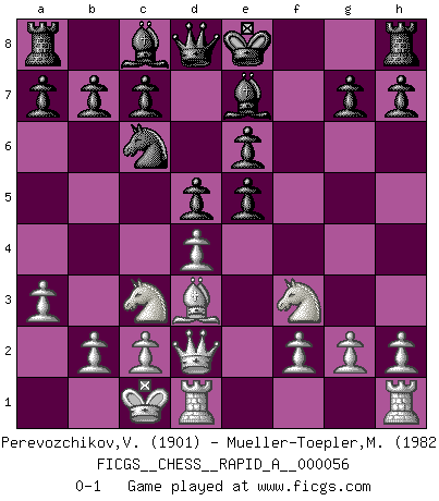 Last move : 0-1 2009 January 16 13:26:56 [Event "FICGS__CHESS__RAPID_A__000056"] [Site "FICGS"] [Date "2008.12.26"] [Round "1"] [White "Perevozchikov,Vjacheslav"] [Black "Mueller-Toepler,Michael"] [Result "0-1"] [WhiteElo "1901"] [BlackElo "1982"] 1.e4 e6 2.d4 d5 3.Nc3 Nc6 4.Nf3 Nf6 5.e5 Ne4 6.Bd3 Bb4 7.Bd2 Nxd2 8.Qxd2 f6 9.a3 Be7 10.O-O-O fxe5 0-1 French : Paulsen variation Queenside Castling by player White (move 10) Player Black won this chess game. Follow this game move after move (download)The way he plays Chess demonstrates a man's whole nature. (Stanley Ellin) Man braucht nicht immer den besten Zug zu spielen: Ein Zug muß aktiv, unternehmungslustig, korrekt und schön sein. (David Bronstein) Una partida de Ajedrez se divide en 3 etapas: la primera cuando piensas que tienes la ventaja, la segunda cuando crees que tienes la ventaja y la tercera... ¡cuando te das cuenta que vas a perder!. (Savielly Tartakower) Le succès, c'est être capable d'aller d'échec en échec sans perdre son enthousiasme. (Winston Churchill) There are two types of people in this world, good and bad. The good sleep better, but the bad seem to enjoy the waking hours much more. (Woody Allen)