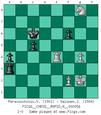 Last move : 1-0 2009 January 15 18:38:54 [Event "FICGS__CHESS__RAPID_A__000056"] [Site "FICGS"] [Date "2008.12.26"] [Round "1"] [White "Perevozchikov,Vjacheslav"] [Black "Salonen,Jukka"] [Result "1-0"] [WhiteElo "1901"] [BlackElo "1904"] 1.d4 d5 2.c4 e6 3.Nf3 Nf6 4.g3 dxc4 5.Bg2 c5 6.O-O Nc6 7.Qa4 cxd4 8.Nxd4 Qxd4 9.Bxc6+ Bd7 10.Rd1 Bxc6 11.Qxc6+ Qd7 12.Rxd7 bxc6 13.Rc7 c5 14.Na3 c3 15.Rb7 a6 16.bxc3 Ne4 17.Bb2 Nd6 18.Rb6 Kd7 19.Bc1 Ne4 20.Nc4 Nxc3 21.Kf1 Ke8 22.Bd2 Nd5 23.Rb7 f5 24.e4 fxe4 25.Re1 Nf6 26.Bg5 Rg8 27.Reb1 h6 28.Bxf6 gxf6 29.R1b6 Rg7 30.Rxe6+ Re7 31.Nd6+ Kd8 32.Nf7+ Ke8 33.Rbxe7+ Bxe7 34.Nxh6 Kd7 35.Rxe4 Rc8 36.Nf5 Bf8 37.Ke2 Rb8 38.h4 Rb2+ 39.Kf3 Rxa2 40.h5 a5 41.h6 Bxh6 42.Nxh6 a4 43.g4 Kc6 44.Ng8 Ra3+ 45.Kg2 1-0 Queen's gambit declined Kingside Castling by player White (move 6) 10 pieces endgame at move 42 : White KRNPP , Black KRPPP WHITE : King + 1 Rook 1 Knight 2 Pawns BLACK : King + 1 Rook 3 Pawns Player White won this chess game. Follow this game move after move (download)If Chess is a science, it's a most inexact one. If Chess is an art, it is too exacting to be seen as one. If Chess is a sport, it's too esoteric. If Chess is a game, it's too demanding to be just a game. If Chess is a mistress, she's a demanding one. If Chess is a passion, it's a rewarding one. If Chess is life, it's a sad one. (Unknown) Man wirke der falschen Auffassung entgegen, als ob jeder Zug Unmittelbares zu leisten habe; auch Werte- und Ruhezüge haben ihre Existenzberechtigung. (Aaron Nimzowitsch) El Ajedrez es parte de la cultura, y si una cultura esta en decadencia, entonces también el Ajedrez declinará. (Mikhail Botvinnik) Une platitude souvent récitée à propos des Echecs est qu'une des choses les plus difficiles à réaliser est de gagner une position gagnante. Cela ne manque pas de sens mais, pour ma part, j'ai toujours trouvé plus difficile de gagner une position perdante. (Tim Krabbe) Is not life a hundred times too short to bore ourselves ? (Friedrich Nietzsche)