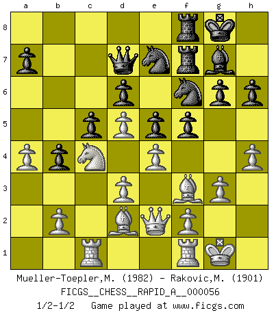 Last move : 1/2-1/2 2009 January 27 13:46:36 [Event "FICGS__CHESS__RAPID_A__000056"] [Site "FICGS"] [Date "2008.12.26"] [Round "1"] [White "Mueller-Toepler,Michael"] [Black "Rakovic,Miroslav"] [Result "1/2-1/2"] [WhiteElo "1982"] [BlackElo "1901"] 1.Nf3 Nf6 2.c4 c5 3.Nc3 Nc6 4.g3 e5 5.Bg2 g6 6.d3 Bg7 7.Bg5 d6 8.O-O O-O 9.Nd5 Be6 10.Nd2 Bxd5 11.cxd5 Ne7 12.e4 h6 13.Be3 Qd7 14.Nc4 b5 15.Na5 Qc7 16.Bd2 Qd7 17.Bf3 Nh7 18.a4 b4 19.Qe2 f5 20.h4 Rf7 21.Nc4 Nf6 22.Rac1 Raf8 1/2-1/2 Reti Opening Kingside Castling by player White (move 8) Kingside Castling by player Black (move 8) This chess game ended in a draw. Follow this game move after move (download)Via the squares on the chessboard, the Indians explain the movement of time and the age, the higher influences which control the world and the ties which link Chess with the human soul. (Al-Masudi) Kombinieren und Schwarzhandel gehören verboten. (Savielly Grigorievitsch Tartakower) Si tu oponente no puede hacer nada activo, entonces no apures la posición; En vez de eso, dejalo estar sentado ahí, sufriendo y rogandote por un empate. (Jeremy Silman) Tout change constamment, y compris dans le monde des Echecs. (Botvinnik) You have to believe in yourself. (Sun Tzu)
