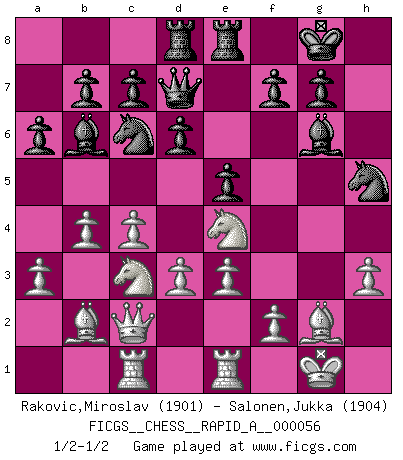 Last move : 1/2-1/2 2009 January 13 9:5:33 [Event "FICGS__CHESS__RAPID_A__000056"] [Site "FICGS"] [Date "2008.12.26"] [Round "1"] [White "Rakovic,Miroslav"] [Black "Salonen,Jukka"] [Result "1/2-1/2"] [WhiteElo "1901"] [BlackElo "1904"] 1.c4 e5 2.g3 Nf6 3.Bg2 Nc6 4.Nc3 Bc5 5.e3 O-O 6.a3 d6 7.Nge2 Bb6 8.O-O Bg4 9.h3 Bh5 10.b4 h6 11.d3 Qd7 12.Bb2 a6 13.g4 Bg6 14.Ng3 Rad8 15.Rc1 Rfe8 16.Re1 Rb8 17.Qa4 Rbd8 18.Qc2 h5 19.gxh5 Nxh5 20.Nge4 1/2-1/2 English Opening Kingside Castling by player Black (move 5) Kingside Castling by player White (move 8) This chess game ended in a draw. Follow this game move after move (download)I feel as if I were a piece in a game of Chess, when my opponent says of it: That piece cannot be moved. (Soren Kierkegaard) Wer nie einen Fehler gemacht hat, hat nie etwas Neues ausprobiert. (Albert Einstein) Aquel que ve no otra dirección en el juego que la de dar Jaque Mate a su oponente, nunca será un buen jugador de Ajedrez. (Euwe) Il n'y a pas de prix trop élevé au scalp de l'ennemi. (Koblentz) I teach you to lie, cheat and steal, and as soon as my back's turned you wait in line ? (Gregory House, House M.D.)