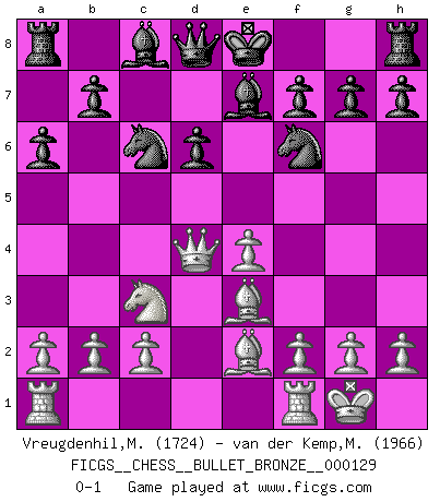 Last move : 0-1 2009 July 10 18:28:56 [Event "FICGS__CHESS__BULLET_BRONZE__000129"] [Site "FICGS"] [Date "2009.07.10"] [Round "1"] [White "Vreugdenhil,Maarten"] [Black "van der Kemp,Michel"] [Result "0-1"] [WhiteElo "1724"] [BlackElo "1966"] 1.e4 c5 2.Nf3 d6 3.d4 cxd4 4.Nxd4 Nf6 5.Nc3 a6 6.Be2 e5 7.O-O exd4 8.Qxd4 Be7 9.Be3 Nc6 0-1 Sicilian : Najdorf, Opovcensky variation Kingside Castling by player White (move 7) Player Black won this chess game. Follow this game move after move (download)I guess a certain amount of temperament is expected of Chess geniuses. (Ron Gross) Im Reiche der Wirklichkeit ist man nie so glücklich wie im Reiche der Gedanken. (Arthur Schopenhauer) Por tratar de evitar la pérdida de una pieza, muchas personas han perdido una partida de Ajedrez. (Savielly Tartakover) La vérité est comme le meilleur coup aux échecs : elle existe, mais il faut la chercher. (Arturo Perez-Reverte) O divine art of subtlety and secrecy! Through you we learn to be invisible, through you inaudible and hence we can hold the enemy's fate in our hands. (Sun Tzu)