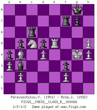 Last move : 1/2-1/2 2009 January 7 11:16:44 [Event "FICGS__CHESS__CLASS_B__000066"] [Site "FICGS"] [Date "2008.12.29"] [Round "1"] [White "Perevozchikov,Vjacheslav"] [Black "Riha,Josef"] [Result "1/2-1/2"] [WhiteElo "1901"] [BlackElo "1932"] 1.d4 Nf6 2.c4 e6 3.Nf3 d5 4.Nc3 c6 5.Bg5 Nbd7 6.e3 Qa5 7.Nd2 Bb4 8.Qc2 O-O 9.Be2 e5 10.O-O exd4 11.Nb3 Qb6 12.exd4 dxc4 13.Bxc4 a5 14.Ne4 Nxe4 15.Qxe4 Qc7 16.Bd3 f5 17.Qh4 Nb6 18.a3 Bd6 19.Rfe1 Qf7 20.Nc5 h6 21.Bd2 Nd5 22.Bc4 f4 23.Bd3 Be7 24.Rxe7 Qxe7 25.Qxe7 Nxe7 26.Re1 Nd5 27.Bc4 f3 28.g3 a4 29.Nd3 Kh7 30.Bxd5 cxd5 31.Re7 Ra6 32.Nc5 Rc6 33.h4 b5 34.Bc3 Bf5 35.Re5 Rg6 36.Be1 Bb1 37.Kh2 Ba2 38.Bb4 Rc8 39.Kh3 Rf6 40.g4 Rf4 41.Re7 h5 42.gxh5 Kg8 43.Bd2 Rf7 44.Re5 Rc6 45.Kg4 Bb3 46.Bb4 1/2-1/2 Queen's pawn game Kingside Castling by player Black (move 8) Kingside Castling by player White (move 10) This chess game ended in a draw. Follow this game move after move (download)Combinations have always been the most intriguing aspect of Chess. The masters look for them, the public applauds them, the critics praise them. It is because combinations are possible that Chess is more than a lifeless mathematical exercise. They are the poetry of the game; they are to Chess what melody is to music. They represent the triumph of mind over matter. (Reuben Fine) Sie führen leise Selbstgespräche, schlürfen lautstark ihre Getränke, schmatzen hörbar beim Essen, blasen ihrem Gegenüber Rauch in die Augen, niesen ihm ins Gesicht, starren ihn unverwandt an, bis er sich unter ihren Blicken windet, rutschen ständig auf ihrem Stuhl hin und her, rülpsen und bohren in der Nase. (Anonymous) Botvinnik trató de alejar el misterio referente al Ajedrez, siempre relacionandolo a situaciones de la vida diaria. Solía llamar al Ajedrez un problema inexacto típico, similar a aquellos en que la gente tiene siempre que resolver a cada día. (Garry Kasparov) Les Echecs mettent en conflit, non pas deux intelligences, mais deux volontés. (Lasker) The leaves of memory seemed to make a mournful rustling in the dark. (Henry Wadsworth Longfellow)