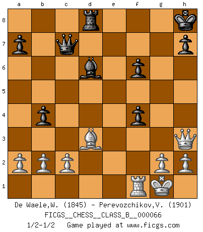Last move : 1/2-1/2 2009 January 11 22:10:3 [Event "FICGS__CHESS__CLASS_B__000066"] [Site "FICGS"] [Date "2008.12.29"] [Round "1"] [White "De Waele,Willy"] [Black "Perevozchikov,Vjacheslav"] [Result "1/2-1/2"] [WhiteElo "1845"] [BlackElo "1901"] 1.e4 e5 2.Nf3 d6 3.d4 exd4 4.Nxd4 Nf6 5.Nc3 Be7 6.Bc4 O-O 7.O-O Nc6 8.Bf4 Ne5 9.Bb3 c5 10.Nf5 Bxf5 11.exf5 Qc8 12.Bxe5 dxe5 13.Qd3 Rd8 14.Nd5 Nxd5 15.Bxd5 Rd6 16.Rad1 Qd7 17.f6 gxf6 18.f4 c4 19.Qxc4 b5 20.Qb3 Rd8 21.Bxf7+ Kh8 22.Rxd6 Bxd6 23.Be6 Qc6 24.Bf5 exf4 25.Qh3 Qc7 26.Bd3 b4 1/2-1/2 Philidor : Exchange variation Kingside Castling by player Black (move 6) Kingside Castling by player White (move 7) This chess game ended in a draw. Follow this game move after move (download)Play the opening like a book, the middle game like a magician, and the endgame like a machine. (Spielmann) Alle Schachspieler sollten auch ein Hobby haben. (Savielly Grigorievitsch Tartakower) Cuando tu casa esta en llamas, no puedes ser molestado por tus vecinos. O, como decinos en Ajedrez, si tu Rey esta bajo ataque, no te preocupa perder un Peón del lado de la Reina. (Gary Kasparov) Les ravages du H expliquent la différence de niveau entre Tal et Thal [Abergel]. Art is the only way to run away without leaving home. (Twyla Tharp)