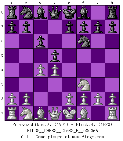 Last move : 0-1 2009 January 31 1:39:34 [Event "FICGS__CHESS__CLASS_B__000066"] [Site "FICGS"] [Date "2008.12.29"] [Round "1"] [White "Perevozchikov,Vjacheslav"] [Black "Block,Benjamin"] [Result "0-1"] [WhiteElo "1901"] [BlackElo "1820"] 1.d4 d5 2.c4 c6 3.Nf3 Nf6 0-1 QGD Slav : 3.Nf3 Player Black won this chess game. Follow this game move after move (download)Chess mastery essentially consists of analyzing Chess positions accurately. (Mikhail Botvinnik) Obwohl ich alt bin, darf mir niemand den Finger in den Mund stecken, sonst beisse ich. (Wilhelm Steinitz) El estómago es una parte esencial del maestro de Ajedrez. (Bent Larsen) L'attaque fait le spectacle, la défense gagne les matchs. (Dicton footballistique) Luck never gives; it only lends. (Swedish proverb)