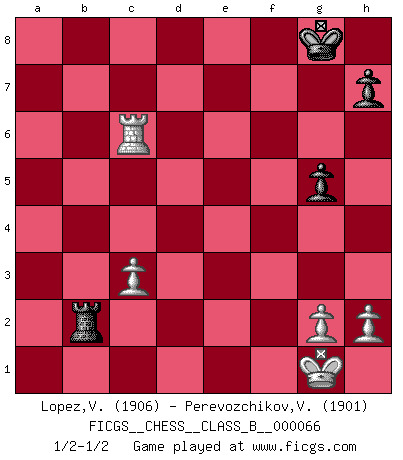 Last move : 1/2-1/2 2009 January 12 19:59:52 [Event "FICGS__CHESS__CLASS_B__000066"] [Site "FICGS"] [Date "2008.12.29"] [Round "1"] [White "Lopez,Victor"] [Black "Perevozchikov,Vjacheslav"] [Result "1/2-1/2"] [WhiteElo "1906"] [BlackElo "1901"] 1.e4 e5 2.Bc4 Nf6 3.d4 exd4 4.Nf3 Nc6 5.e5 d5 6.Bb5 Ne4 7.Nxd4 Bd7 8.Bxc6 bxc6 9.O-O Bc5 10.f3 Ng5 11.Be3 O-O 12.f4 Ne4 13.Nd2 f6 14.Nxe4 dxe4 15.Qe2 Bg4 16.Qf2 Qd7 17.Nb3 Bxe3 18.Qxe3 fxe5 19.fxe5 Qd5 20.Rxf8+ Rxf8 21.Re1 Qxe5 22.Qxe4 Qxe4 23.Rxe4 Bd1 24.c3 Rb8 25.Ra4 Bxb3 26.axb3 Rxb3 27.Rxa7 Rxb2 28.Rxc7 g5 29.Rxc6 1/2-1/2 Bishop's Opening : Urusov gambit Kingside Castling by player White (move 9) Kingside Castling by player Black (move 11) 10 pieces endgame at move 28 : White KRPPP , Black KRPPP WHITE : King + 1 Rook 3 Pawns BLACK : King + 1 Rook 3 Pawns 9 pieces endgame at move 29 : White KRPPP , Black KRPP WHITE : King + 1 Rook 3 Pawns BLACK : King + 1 Rook 2 Pawns This chess game ended in a draw. Follow this game move after move (download)Fischer prefers to enter Chess history alone. (Miguel Najdorf) Über Frauen: Chess is better. (Robert James Fischer) Bobby Fischer es el mas grande genio de Ajedrez de todos los tiempos. (Alexander Kotov) Les réformistes prétendent que les progrès de la théorie conduiront à la disparition des échecs, et qu'il faut, pour leur rendre vie, en remanier les règles. En réalité, qu'exprime cette affirmation? Le mépris de l'intuition, de l'imagination et de tous les autres éléments qui font des échecs un art. (Alexander Alekhine) Logic : The art of thinking and reasoning in strict accordance with the limitations and incapacities of the human misunderstanding. (Ambrose Bierce)