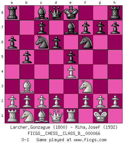 Last move : 0-1 2009 February 9 20:54:10 [Event "FICGS__CHESS__CLASS_B__000066"] [Site "FICGS"] [Date "2008.12.29"] [Round "1"] [White "Larcher,Gonzague"] [Black "Riha,Josef"] [Result "0-1"] [WhiteElo "1800"] [BlackElo "1932"] 1.e4 e5 2.Nf3 Nc6 3.Bb5 a6 4.Ba4 Nf6 5.O-O Be7 6.Re1 b5 7.Bb3 d6 0-1 This chess game has been lost on time (started : 2008.12.29 10:25:37) Ruy Lopez : Closed Kingside Castling by player White (move 5) Player Black won this chess game. Follow this game move after move (download)Only the player with the initiative has the right to attack. (Wilhelm Steinitz) Gewöhnliche Menschen denken nur daran, wie sie ihre Zeit verbringen. Ein intelligenter Mensch versucht, sie auszunutzen. (Arthur Schopenhauer) Ayuda a tus piezas para que ellas te puedan ayudar. (Paul Morphy) Le thème de l'attaque double intervient d'une manière ou d'une autre dans l'immense majorité des combinaisons. (Youri Averbakh) Somewhere in the world there is an epigram for every dilemma. (Hendrik Willem van Loon)