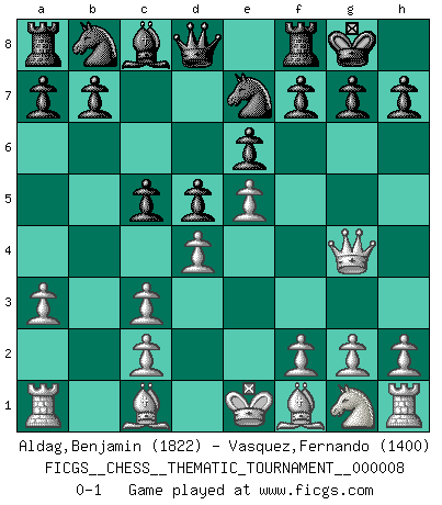 Last move : 0-1 2006 November 21 2:34:34 [Event "FICGS__CHESS__THEMATIC_TOURNAMENT__000008"] [Site "FICGS"] [Date "2006.08.22"] [Round "1"] [White "Aldag,Benjamin"] [Black "Vasquez,Fernando"] [Result "0-1"] [WhiteElo "1822"] [BlackElo "1400"] 1.d4 d5 2.e4 e6 3.Nc3 Bb4 4.e5 Ne7 5.a3 Bxc3+ 6.bxc3 c5 7.Qg4 O-O 0-1 Blackmar gambit Kingside Castling by player Black (move 7) Player Black won this chess game. Follow this game move after move (download)Some part of a mistake is always correct. (Savielly Tartakover) Die Auseinandersetzung mit Karpow war politisch geprägt. Er stand für das kommunistische System, wurde von dessen Repräsentanten gehätschelt. Ich war der Oppositionelle. Jeder Schachweltmeister spiegelt auch die gesellschaftlichen Verhältnisse wider. Kramnik steht für die Börsen-Generation des Neuen Markts, ideologiefrei, zahlenfixiert. (Garry Kasparov) El Ajedrez es parte de la cultura, y si una cultura esta en decadencia, entonces también el Ajedrez declinará. (Mikhail Botvinnik) Les Echecs sont affaire de jugement sensible. Savoir quand frapper et quand esquiver. (Fischer) . 'gn is not allowed in chess unless n is an integer between 1 and 8 inclusive, where 1 and 8 are to interpreted as the standard numerals standing for integers in the ordered real-closed field R, with the *canonical* ordering. (As opposed to, say, an integer in the domain Z[2+i*sqrt(5)] or an integer in some exotic Grothendieck topos). (Normajean Yates)