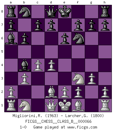 Last move : 1-0 2009 February 14 9:7:46 [Event "FICGS__CHESS__CLASS_B__000066"] [Site "FICGS"] [Date "2008.12.29"] [Round "1"] [White "Migliorini,Roberto"] [Black "Larcher,Gonzague"] [Result "1-0"] [WhiteElo "1963"] [BlackElo "1800"] 1.d4 Nf6 2.c4 e6 3.Nf3 b6 4.g3 Ba6 5.b3 Bb4+ 6.Bd2 1-0 This chess game has been lost on time (started : 2008.12.29 10:25:37) Queen's Indian : Nimzovich variation (exaggerated Fianchetto) Player White won this chess game. Follow this game move after move (download)Examine moves that smite! A good eye for smites is far more important than a knowledge of strategical principles. (Purdy) Ich organisiere ein großes Turnier, was mich etwa 120000 Dollar kostet. Ich denke, das ist das erste Mal in der Schachgeschichte, daß ein Schachgroßmeister auch als Mäzen auftritt. (Miguel Najdorf) El tablero es el mundo, las piezas es el fenomeno del universo, las reglas del juego son lo que llamamos leyes de la naturaleza y el jugador del lado opuesto, se encuentra oculto a nuestra vista. (Thomas Huxley) Les échecs, c'est l'art d'analyser. (Mikhail Botvinnik) Life is like a game of cards: the hand you are dealt represents determinism; the way you play it is free will. (Jawaharlal Nehru)