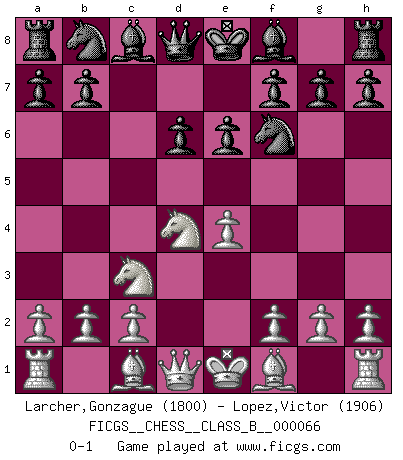 Last move : 0-1 2009 February 12 9:2:24 [Event "FICGS__CHESS__CLASS_B__000066"] [Site "FICGS"] [Date "2008.12.29"] [Round "1"] [White "Larcher,Gonzague"] [Black "Lopez,Victor"] [Result "0-1"] [WhiteElo "1800"] [BlackElo "1906"] 1.e4 c5 2.Nf3 e6 3.d4 cxd4 4.Nxd4 Nf6 5.Nc3 d6 0-1 This chess game has been lost on time (started : 2008.12.29 10:25:37) Sicilian : Anderssen variation Player Black won this chess game. Follow this game move after move (download)Who is your opponent tonight, tonight I am playing against the Black pieces. (Akiba Rubinstein) Der Partner hat auch seine Existenzberechtigung. (Savielly Grigorievitsch Tartakower) El Ajedrez es un mar en el cual un mosquito puede beber y un elefante puede bañarse. (Refrán Hindú) La vérité est comme le meilleur coup aux échecs : elle existe, mais il faut la chercher. (Arturo Perez-Reverte) The quality of decision is like the well-timed swoop of a falcon which enables it to strike and destroy its victim. (Sun Tzu)