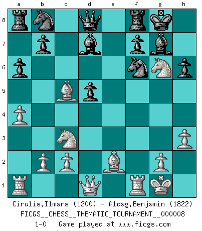 Last move : 1-0 2006 November 13 22:52:19 [Event "FICGS__CHESS__THEMATIC_TOURNAMENT__000008"] [Site "FICGS"] [Date "2006.08.22"] [Round "1"] [White "Cirulis,Ilmars"] [Black "Aldag,Benjamin"] [Result "1-0"] [WhiteElo "1200"] [BlackElo "1822"] 1.d4 d5 2.e4 dxe4 3.Nc3 Nf6 4.f3 c5 5.d5 exf3 6.Nxf3 a6 7.Bf4 g6 8.Be2 Bg7 9.O-O O-O 10.a4 Bg4 11.h3 Bf5 12.Nh4 Bd7 13.Bg5 h6 14.Be3 e6 15.Bxc5 exd5 16.Nxg6 1-0 Blackmar gambit Kingside Castling by player White (move 9) Kingside Castling by player Black (move 9) Player White won this chess game. Follow this game move after move (download)Examine moves that smite! A good eye for smites is far more important than a knowledge of strategical principles. (Purdy) Privat ist Kortschnoi kein schlechter Mensch, sehr sympathisch. Aber während des Spiels ist er grausam. Er will dich töten. (Miguel Najdorf) Las piezas de Ajedrez son los bloques del alfabeto que moldean los pensamientos; y esos pensamientos, aunque hagan un diseño visual en el tablero, expresan abstractamente su belleza como un poema. (Marcel Duchamp) Les échecs, c'est la lutte contre l'erreur. (Johannes Zukertort) You cannot beat a roulette table unless you steal money from it. (Albert Einstein)