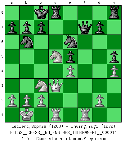 Last move : 1-0 2009 February 24 5:41:16 [Event "FICGS__CHESS__NO_ENGINES_TOURNAMENT__000014"] [Site "FICGS"] [Date "2008.12.31"] [Round "1"] [White "Leclerc,Sophie"] [Black "Inving,Yugi"] [Result "1-0"] [WhiteElo "1200"] [BlackElo "1272"] 1.h4 Nf6 2.d4 d5 3.Nf3 Nc6 4.Nc3 Bf5 5.Bf4 h5 6.e3 e6 7.Bd3 Bxd3 8.Qxd3 Bd6 9.Bxd6 Qxd6 10.O-O-O O-O-O 11.Ng5 Qe7 12.f3 Nd7 13.Kb1 f6 14.Nh3 Nb6 15.Nf4 Qf7 16.e4 e5 17.Nfxd5 Nxd4 18.f4 Ne6 19.fxe5 fxe5 20.Rhf1 1-0 Anti-Borg (Desprez) Opening Queenside Castling by player White (move 10) Queenside Castling by player Black (move 10) Player White won this chess game. Follow this game move after move (download)Life is like a game of Chess, changing with each move. (Chinese proverb) Computer sind die einzigen Gegner, die nicht immer eine Ausrede auf Lager haben, wenn sie gegen mich verlieren. (Robert James Fischer) No todos los artistas son jugadores de Ajedrez, pero todos los jugadores de Ajedrez son artistas. (Marcel Duchamp) Echiquier : carré parfait, comme la Jérusalem nouvelle décrite par l'auteur de l'Apocalypse, huit cases sur huit, exaltation du chiffre 4, symbole du cosmos aux quatre horizons... où le noir et le blanc, l'ombre et la lumière, le mal et le bien s'entremêlent et se conjuguent. (Robert Couffignal, Le Gambit du poète) My poor ole parrot... Is not in the circulation of displays ....poo hoo hoo :) (Wayne Lowrance's enigma)