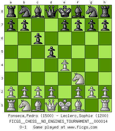 Last move : 0-1 2009 February 10 20:57:54 [Event "FICGS__CHESS__NO_ENGINES_TOURNAMENT__000014"] [Site "FICGS"] [Date "2008.12.31"] [Round "1"] [White "Fonseca,Pedro"] [Black "Leclerc,Sophie"] [Result "0-1"] [WhiteElo "1500"] [BlackElo "1200"] 1.e4 c6 2.Nf3 d5 0-1 This chess game has been lost on time (started : 2008.12.31 16:54:41) Caro-Kann defense Player Black won this chess game. Follow this game move after move (download)We must make sure that Chess will not be like a dead language, very interesting, but for a very small group. (Sytze Faber) Der 70jährige Viktor Kortschnoi: Die Rentenanstalt wollte mich zwingen in Rente zu gehen. Meine Frau erhält jetzt eine Pension- und ich zahle weiter in die Rentenkasse ein! (Viktor Kortschnoi) No es suficiente ser un buen jugador, se debe también de jugar bién. (Siegbert Tarrasch) Il n'y a pas eu de défaite parce que je ne crois pas que cet ordinateur ait jamais existé. IBM a triché en refusant d'imprimer les modes de recherche de la machine. C'est évident, pendant le match, des coups décisifs ont été joués par des êtres humains. Aujourd'hui, les meilleurs spécialistes en informatique ne peuvent toujours pas expliquer comment Deep-Blue a pu jouer contre la logique des ordinateurs. IBM a gagné une guerre de communication, mais ils sont incapables de prouver que l'ordinateur a gagné tout seul. (Garry Kasparov) You cannot beat a roulette table unless you steal money from it. (Albert Einstein)