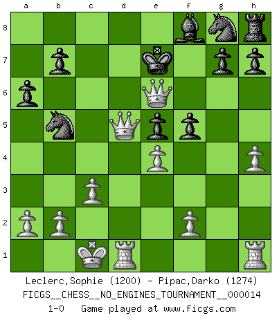Last move : 1-0 2009 January 26 19:7:42 [Event "FICGS__CHESS__NO_ENGINES_TOURNAMENT__000014"] [Site "FICGS"] [Date "2008.12.31"] [Round "1"] [White "Leclerc,Sophie"] [Black "Pipac,Darko"] [Result "1-0"] [WhiteElo "1200"] [BlackElo "1274"] 1.h4 c5 2.e4 Nc6 3.Nf3 d6 4.d4 Bg4 5.d5 Nd4 6.Qd3 Bxf3 7.gxf3 a6 8.Na3 e5 9.c3 c4 10.Nxc4 Nb5 11.f4 f6 12.Bh3 Rc8 13.Be3 Rb8 14.O-O-O Nc7 15.fxe5 dxe5 16.d6 Nb5 17.Bb6 Qxb6 18.Nxb6 Rd8 19.d7+ Kf7 20.Be6+ Kxe6 21.Qd5+ Ke7 22.Nc8+ Rxc8 23.dxc8Q f5 24.Qce6+ 1-0 Anti-Borg (Desprez) Opening Queenside Castling by player White (move 14) Promotion Queen by player White (move 23) Player White won this chess game. Follow this game move after move (download)Bobby Fischer's current state of mind is indeed a tragedy. One of the world's greatest Chess players - the pride and sorrow of American Chess. (Frank Brady) Strategie ist, wie man ein Mädchen auf den Rücksitz bekommt. Taktik ist, was man tut, wenn man dann dort ist. (Anonymous) El poder defensivo de una pieza clavada, solamente es imaginario. (Aaron Nimzovich) Les ravages du H expliquent la différence de niveau entre Tal et Thal [Abergel]. We're missing something. (Gregory House, House M.D.)