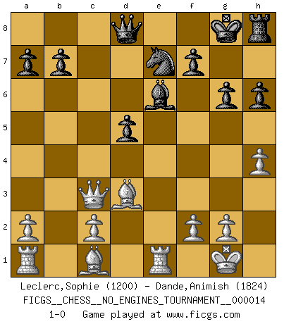 Last move : 1-0 2009 April 5 14:10:15 [Event "FICGS__CHESS__NO_ENGINES_TOURNAMENT__000014"] [Site "FICGS"] [Date "2008.12.31"] [Round "1"] [White "Leclerc,Sophie"] [Black "Dande,Animish"] [Result "1-0"] [WhiteElo "1200"] [BlackElo "1824"] 1.h4 d5 2.e3 e5 3.d4 Nc6 4.dxe5 Nxe5 5.Be2 Bd6 6.Nc3 c6 7.e4 Be6 8.exd5 cxd5 9.Nf3 h6 10.Nxe5 Bxe5 11.Bb5+ Kf8 12.Qe2 Bxc3+ 13.bxc3 Ne7 14.O-O Rc8 15.Bd3 Rxc3 16.Re1 g6 17.Qe5 Kg8 18.Qxc3 1-0 This chess game has been lost on time (started : 2008.12.31 16:54:41) Anti-Borg (Desprez) Opening Kingside Castling by player White (move 14) Player White won this chess game. Follow this game move after move (download)Chess is a foolish expedient for making idle people believe they are doing something very clever when they are only wasting their time. (George Bernard Shaw) Versuche, dich von der Sklaverei der Eröffnungsvarianten zu befreien. Stattdessen soll man gewisse Typenpositionen erlernen, die man eingehend analysiert. (Aaron Nimzowitsch) Todos los jugadores de Ajedrez deberían tener un pasatiempo. (Savielly Tartakower) Les réformistes prétendent que les progrès de la théorie conduiront à la disparition des échecs, et qu'il faut, pour leur rendre vie, en remanier les règles. En réalité, qu'exprime cette affirmation? Le mépris de l'intuition, de l'imagination et de tous les autres éléments qui font des échecs un art. (Alexander Alekhine) No, no, you're not thinking; you're just being logical. (Niels Bohr)