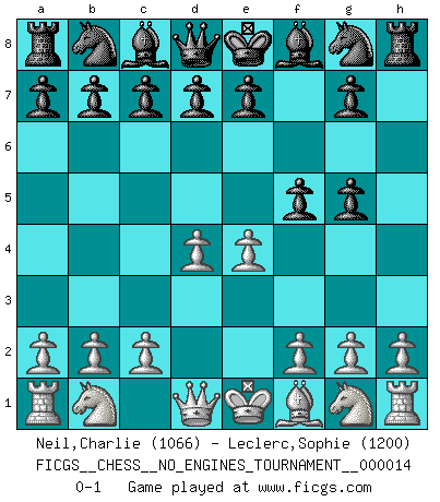 Last move : 0-1 2009 January 20 23:14:2 [Event "FICGS__CHESS__NO_ENGINES_TOURNAMENT__000014"] [Site "FICGS"] [Date "2008.12.31"] [Round "1"] [White "Neil,Charlie"] [Black "Leclerc,Sophie"] [Result "0-1"] [WhiteElo "1066"] [BlackElo "1200"] 1.d4 f5 2.Bg5 h6 3.e4 hxg5 0-1 Dutch, 2.Bg5 variation Player Black won this chess game. Follow this game move after move (download)A thorough understanding of the typical mating continuations makes the most complicated sacrificial combinations leading up to them not only not difficult, but almost a matter of course. (Siegbert Tarrasch) Der zweitbeste Zug ist oft der einzig richtige. (Savielly Grigorievitsch Tartakower) Una compensación adecuada por un sacrificio es tener una combinación sólida que conduce a una posición ganadora; una compensación adecuada por una metida de pata es dejar a tu oponente arrebatar una derrota de las fauces de la victoria. (Bruce A. Moon) Le profane ne songe pas à la somme de jouissance dont il se prive, qui méconnaît ce jeu aux ressources aussi variées que passionnantes. (Jean-Marie Jeanton-Lamarche) Control your own destiny or someone else will. (Jack Welch)