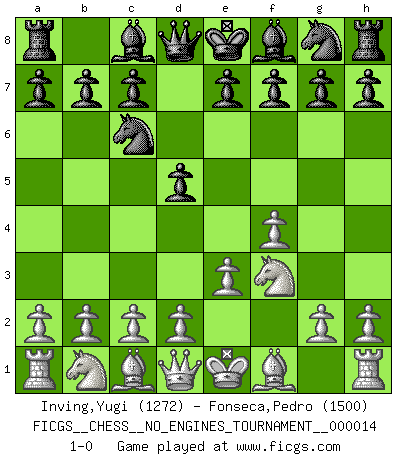 Last move : 1-0 2009 February 10 20:57:54 [Event "FICGS__CHESS__NO_ENGINES_TOURNAMENT__000014"] [Site "FICGS"] [Date "2008.12.31"] [Round "1"] [White "Inving,Yugi"] [Black "Fonseca,Pedro"] [Result "1-0"] [WhiteElo "1272"] [BlackElo "1500"] 1.f4 d5 2.Nf3 Nc6 3.e3 1-0 This chess game has been lost on time (started : 2008.12.31 16:54:41) Bird's Opening Player White won this chess game. Follow this game move after move (download)The enormous mental resilience, without which no Chess player can exist, was so much taken up by Chess that he could never free his mind of this game. (Albert Einstein) Ich verlor meine Bürgerrechte, mein Gehalt wurde mir nicht mehr bezahlt und ich wurde zensiert und durfte nicht mehr ins Ausland reisen. [nach dem Match Fischer-Taimanov 6:0] (Mark Taimanov) El jugador blanco perdió porque fallo en recordar la coreccta continuación y tuvo que pensar por sí mismo las movidas. (Siegbert Tarrasch) Celui qui prend des risques peut perdre, celui qui n'en prend pas perd toujours. (Xavier Tartacover) Somewhere in the world there is an epigram for every dilemma. (Hendrik Willem van Loon)