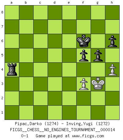 Last move : 0-1 2009 March 15 9:10:54 [Event "FICGS__CHESS__NO_ENGINES_TOURNAMENT__000014"] [Site "FICGS"] [Date "2008.12.31"] [Round "1"] [White "Pipac,Darko"] [Black "Inving,Yugi"] [Result "0-1"] [WhiteElo "1274"] [BlackElo "1272"] 1.e4 c5 2.Nf3 Nc6 3.d4 cxd4 4.Nxd4 e5 5.Nxc6 bxc6 6.Bc4 Nf6 7.Nc3 Bc5 8.h3 O-O 9.O-O Bd4 10.Bd2 d5 11.exd5 cxd5 12.Be2 Be6 13.Bg5 h6 14.Bxf6 Qxf6 15.Nb5 Bxb2 16.Rb1 e4 17.Nc7 Rab8 18.Bg4 Bxg4 19.Qxg4 Qd6 20.Nxd5 Qxd5 21.Rfd1 Qc4 22.f3 f5 23.Qg3 Qxc2 24.Qd6 Bd4+ 25.Qxd4 Rxb1 26.Rxb1 Qxb1+ 27.Kh2 exf3 28.Qxa7 Qb8+ 29.Qxb8 Rxb8 30.gxf3 Ra8 31.Kg3 Rxa2 32.Kf4 g6 33.h4 Kf7 34.Kg3 Kf6 35.Kh3 Ra4 36.Kg3 g5 0-1 Sicilian : Labourdonnais-Loewenthal variation Kingside Castling by player Black (move 8) Kingside Castling by player White (move 9) 10 pieces endgame at move 29 : White KPPP , Black KRPPPP WHITE : King + 3 Pawns BLACK : King + 1 Rook 4 Pawns 9 pieces endgame at move 30 : White KPPP , Black KRPPP WHITE : King + 3 Pawns BLACK : King + 1 Rook 3 Pawns 8 pieces endgame at move 31 : White KPP , Black KRPPP WHITE : King + 2 Pawns BLACK : King + 1 Rook 3 Pawns Player Black won this chess game. Follow this game move after move (download)It's just you and your opponent at the board and you're trying to prove something. (Bobby Fischer) Wer sich die Fähigkeit anerziehen will im Schach selbstständig zu denken, der muß alles meiden, was leblos ist: ausgeklügelte Theorien, die sich auf sehr wenige Beispiele und eine Menge Hirngespinste stützen. (Emanuel Lasker) No existe un remordimiento como el remordimiento del Ajedrez. (H. G. Wells) Des idées, des idées, j'en ai cent, j'en ai mille. Des bonnes, des mauvaises, applicables, irréalisables... Il suffit de faire le tri ! (Roos) The right perception of any matter and a misunderstanding of the same matter do not wholly exclude each other. (Kafka's the trial)