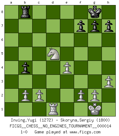 Last move : 1-0 2009 June 5 7:11:32 [Event "FICGS__CHESS__NO_ENGINES_TOURNAMENT__000014"] [Site "FICGS"] [Date "2008.12.31"] [Round "1"] [White "Inving,Yugi"] [Black "Skoryna,Sergiy"] [Result "1-0"] [WhiteElo "1272"] [BlackElo "1800"] 1.e4 e5 2.Nf3 Nc6 3.Bc4 d6 4.Nc3 Bg4 5.h3 Bh5 6.Nxe5 Nxe5 7.Qxh5 Nxc4 8.Qb5+ c6 9.Qxc4 Nf6 10.O-O Be7 11.d3 O-O 12.Qb3 b5 13.a4 a6 14.Be3 bxa4 15.Rxa4 Rb8 16.Qa2 d5 17.Bd4 dxe4 18.dxe4 Rb4 19.Rd1 a5 20.Bxf6 Rxa4 21.Qxa4 Qc7 22.Bxe7 Qxe7 23.Qxc6 Qb4 24.Qb5 Rb8 25.Qxb4 axb4 26.Nd5 1-0 King's pawn game Kingside Castling by player White (move 10) Kingside Castling by player Black (move 11) Player White won this chess game. Follow this game move after move (download)I'm not a materialistic person, in that, I don't suffer the lack or loss of money. The absence of worldly goods I don't look back on. For Chess is a way I can be as materialistic as I want without having to sell my soul. (Jamie Walter Adams) Die Jungen erwarten, dass Opa einfach umfällt. Dann aber kann Opa fünf Stunden lang Schach spielen und die jungen Gegner an die Wand drücken. (Viktor Kortschnoi) Los libros de Ajedrez deben de usarse igual como usamos los anteojos: para mejorar la vista, aunque algunos jugadores los quieren usar como si ellos les otorgaran la vision. (José Raúl Capablanca) Ce qui est bien, c'est d'avoir tout un tas de pièces en prise : l'adversaire ne peut en prendre qu'une à la fois. Cité par Thierry Audin. Computers make it easier to do a lot of things, but most of the things they make it easier to do don't need to be done. (Andy Rooney)