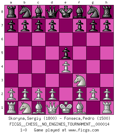 Last move : 1-0 2009 February 12 9:2:24 [Event "FICGS__CHESS__NO_ENGINES_TOURNAMENT__000014"] [Site "FICGS"] [Date "2008.12.31"] [Round "1"] [White "Skoryna,Sergiy"] [Black "Fonseca,Pedro"] [Result "1-0"] [WhiteElo "1800"] [BlackElo "1500"] 1.e4 e5 2.Nf3 1-0 This chess game has been lost on time (started : 2008.12.31 16:54:41) King's knight Opening Player White won this chess game. Follow this game move after move (download)Bobby Fischer is the greatest Chess genius of all time ! (Alexander Kotov) Taktik ist was man tun muß, wenn etwas zu tun ist. Strategie ist was man tun muß, wenn nichts zu tun ist. (Savielly Grigorievitsch Tartakower) Solo el jugador con la iniciativa tiene el derecho a atacar. (Wilhelm Steinitz) Les Echecs, c'est l'art de la guerre sans les charniers, c'est la résurrection des morts tombés au champ d'honneur, l'espoir perpétuel, la suprématie de l'intelligence sur la force, la culture de l'esprit. (F. Szpiner) You can't play chess if you're groggy from pills. (Anatoly Karpov)