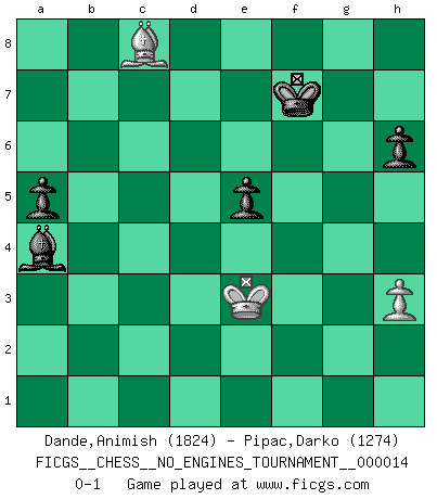 Last move : 0-1 2009 April 16 14:53:19 [Event "FICGS__CHESS__NO_ENGINES_TOURNAMENT__000014"] [Site "FICGS"] [Date "2008.12.31"] [Round "1"] [White "Dande,Animish"] [Black "Pipac,Darko"] [Result "0-1"] [WhiteElo "1824"] [BlackElo "1274"] 1.e4 e5 2.Nf3 Nc6 3.Bb5 a6 4.Ba4 b5 5.Bb3 h6 6.c3 Nf6 7.O-O Bc5 8.a4 b4 9.d4 Bb6 10.Re1 O-O 11.Bc2 Ba5 12.dxe5 Ng4 13.Bf4 Re8 14.Qd5 bxc3 15.bxc3 Bb6 16.Re2 Bb7 17.h3 Nxf2 18.Rxf2 Bxf2+ 19.Kxf2 Rb8 20.Qd3 d6 21.exd6 cxd6 22.Bxd6 Qb6+ 23.Kf1 Rbd8 24.e5 g6 25.Nbd2 Nxe5 26.Nxe5 Rxe5 27.Nc4 Rf5+ 28.Qxf5 gxf5 29.Nxb6 Rxd6 30.Nc4 Rc6 31.Ne5 Rxc3 32.Bxf5 Rc5 33.Re1 f6 34.Bg4 Rxe5 35.Rxe5 fxe5 36.Ke2 Bxg2 37.Ke3 Kf7 38.Bc8 a5 39.Kf2 Bc6 40.Ke3 Bxa4 0-1 Ruy Lopez : Caro variation Kingside Castling by player White (move 7) Kingside Castling by player Black (move 10) 10 pieces endgame at move 35 : White KBPPP , Black KBPPP WHITE : King + 1 Bishop 3 Pawns BLACK : King + 1 Bishop 3 Pawns 9 pieces endgame at move 36 : White KBPP , Black KBPPP WHITE : King + 1 Bishop 2 Pawns BLACK : King + 1 Bishop 3 Pawns 8 pieces endgame at move 40 : White KBP , Black KBPPP WHITE : King + 1 Bishop 1 Pawn BLACK : King + 1 Bishop 3 Pawns Player Black won this chess game. Follow this game move after move (download)I guess a certain amount of temperament is expected of Chess geniuses. (Ron Gross) Wie gewinnt Tal? Er entwickelt alle seine Figuren in die Brettmitte und opfert sie dann irgendwo. (Robert James Fischer) No es suficiente ser un buen jugador, se debe también de jugar bién. (Siegbert Tarrasch) Le jeu d'échecs fait naître et fortifie en nous plusieurs qualités précieuses dans le cours de l'existence, telles que la prévoyance, la circonspection, la prudence, et la persévérance. (Benjamin Franklin - 1783, la morale des échecs) Faith : not wanting to know what is true. (Friedrich Nietzsche)