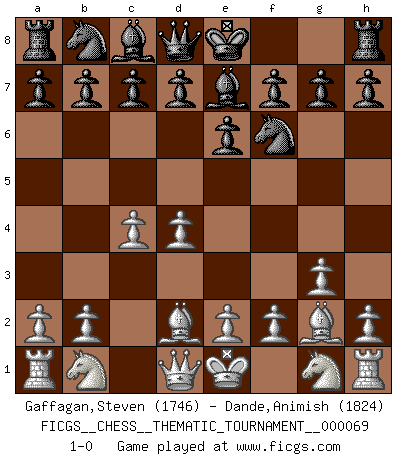 Last move : 1-0 2009 March 6 10:16:46 [Event "FICGS__CHESS__THEMATIC_TOURNAMENT__000069"] [Site "FICGS"] [Date "2009.01.01"] [Round "1"] [White "Gaffagan,Steven"] [Black "Dande,Animish"] [Result "1-0"] [WhiteElo "1746"] [BlackElo "1824"] 1.d4 Nf6 2.c4 e6 3.g3 Bb4+ 4.Bd2 Be7 5.Bg2 1-0 This chess game has been lost on time (started : 2009.01.01 9:34:10) Catalan Opening Player White won this chess game. Follow this game move after move (download)I believe that Chess possesses a magic that is also a help in advanced age. A rheumatic knee is forgotten during a game of Chess and other events can seem quite unimportant in comparison with a catastrophe on the chessboard. (Vlastimil Hort) Früher wurde jeder komplizierte Zug, jedes interessante Opfer mit großem Beifall und Enthusiasmus aufgenommen. Heute schaltet man einfach seinen Fritz an, und man kann sehen, was los ist, ob der Zug geht oder nicht. (Vladimir Kramnik) Aunque la mayoría de la gente disfruta observar las partidas de los grandes Maestros de ataque, algunos de los jugadores mas notables en la historia han sido los jugadores silenciosos posicionales. Lentamente ellos te aplastan despojandote de tu espacio, congestionando tus piezas y dejandote virtualmente sin nada que hacer. (Yasser Seirawan) Vouloir jouer aux échecs contre soi-même est aussi paradoxal que vouloir marcher sur son ombre. (Stefan Zweig) May I never be complete. May I never be content. May I never be perfect. Deliver me, Tyler, from being perfect and complete. (Chuck Palahniuk, Fight Club)
