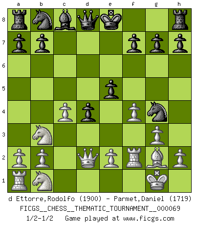 Last move : 1/2-1/2 2009 January 20 7:4:32 [Event "FICGS__CHESS__THEMATIC_TOURNAMENT__000069"] [Site "FICGS"] [Date "2009.01.01"] [Round "1"] [White "d Ettorre,Rodolfo"] [Black "Parmet,Daniel"] [Result "1/2-1/2"] [WhiteElo "1900"] [BlackElo "1719"] 1.d4 Nf6 2.c4 e6 3.g3 c5 4.Nf3 cxd4 5.Nxd4 d5 6.Bg2 e5 7.Nb3 d4 8.f4 Bb4+ 9.Bd2 Ng4 10.O-O Bxd2 11.Qxd2 Ne3 12.Rf2 Ng4 1/2-1/2 Catalan Opening Kingside Castling by player White (move 10) This chess game ended in a draw. Follow this game move after move (download)By playing at Chess then, we may learn: First: Foresight... Second: Circumspection... Third: Caution... And lastly, we learn by Chess the habit of not being discouraged by present bad appearances in the state of our affairs, the habit of hoping for a favorable chance, and that of persevering in the secrets of resources. (Benjamin Franklin) Ein Großmeister muß tausende Partien in seinem Kopf speichern, denn diese sind für Ihn, was die Worte der Muttersprache für gewöhnliche Leute sind, oder Noten für Musiker... (Garry Kasparov) Yo no creo en la psicología. Yo creo en las buenas movidas. (Bobby Fischer) La victoire dans une partie d'Echecs appartient la plupart du temps à celui qui voit un peu plus loin que l'adversaire. (Lasker) For a mechanic, you seem to do an excessive amount of thinking. (C-3PO in Star Wars ep.2)