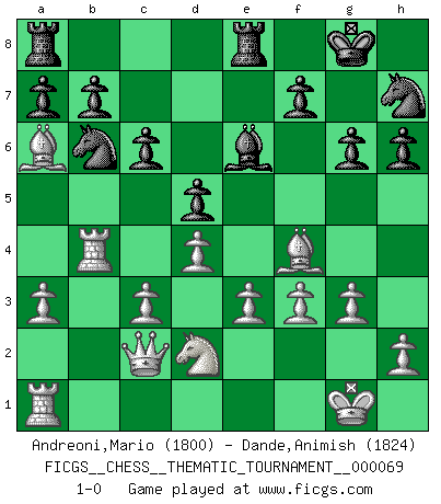 Last move : 1-0 2009 February 15 1:55:17 [Event "FICGS__CHESS__THEMATIC_TOURNAMENT__000069"] [Site "FICGS"] [Date "2009.01.01"] [Round "1"] [White "Andreoni,Mario"] [Black "Dande,Animish"] [Result "1-0"] [WhiteElo "1800"] [BlackElo "1824"] 1.d4 Nf6 2.c4 e6 3.g3 d5 4.Bg2 Nbd7 5.cxd5 exd5 6.Nc3 c6 7.Nf3 Bb4 8.O-O O-O 9.Bf4 h6 10.a3 Bxc3 11.bxc3 Qa5 12.Qc2 Nb6 13.Nd2 Re8 14.e3 Bg4 15.f3 Be6 16.Rfb1 Nh7 17.Rb4 Qa6 18.Bf1 g6 19.Bxa6 1-0 Catalan : Closed Kingside Castling by player White (move 8) Kingside Castling by player Black (move 8) Player White won this chess game. Follow this game move after move (download)No Chess Grandmaster is normal; they only differ in the extent of their madness. (Viktor Korchnoi) Ein Gewinn durch eine ungenaue Kombination, sei sie auch noch so vorzeigbar, erfüllt mich mit Schaudern. (Wilhelm Steinitz) Evita las multitudes. Haz independientemente tu propio razonamiento. Trata de ser el jugador de Ajedrez, no la pieza de Ajedrez. (Ralph Charell) Je menace de comprendre la position. (Anonyme) The best weapon against an enemy is another enemy. (Friedrich Nietzsche)