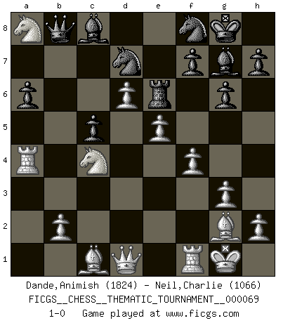 Last move : 1-0 2009 February 2 22:43:18 [Event "FICGS__CHESS__THEMATIC_TOURNAMENT__000069"] [Site "FICGS"] [Date "2009.01.01"] [Round "1"] [White "Dande,Animish"] [Black "Neil,Charlie"] [Result "1-0"] [WhiteElo "1824"] [BlackElo "1066"] 1.d4 Nf6 2.c4 e6 3.g3 c5 4.d5 exd5 5.cxd5 d6 6.Nc3 a6 7.a4 g6 8.Nf3 Bg7 9.Bg2 O-O 10.O-O Nbd7 11.e4 Re8 12.Nd2 Ne5 13.f4 Ned7 14.a5 Nf8 15.Nc4 N6d7 16.Nxd6 Re7 17.e5 b5 18.axb6 Qxb6 19.Nc4 Qb4 20.Ra4 Qb8 21.d6 Re6 22.Nd5 Re8 23.Nc7 Re6 24.Nxa8 1-0 Catalan Opening Kingside Castling by player Black (move 9) Kingside Castling by player White (move 10) Player White won this chess game. Follow this game move after move (download)I give 98 percent of my mental energy to Chess. Others give only 2 percent. (Bobby Fischer) Wie bekannt hörte Morphy 1859 auf, Schach zu spielen. Seine Enttäuschung galt nicht so sehr dem Schach, wie den Schachspielern. (Robert James Fischer) Diferente gente reacciona diferentemente en aceptar la derrota. (Bobby Fischer) Mais n'est-ce pas déjà le limiter injurieusement que d'appeler les échecs un jeu? N'est-ce pas aussi une science, un art, ou quelque chose qui, comme le cercueil de Mahomet entre ciel et terre, est suspendu entre l'un et l'autre, et qui réunit un nombre incroyable de contraires ? (Stefan Zweig) The bottom line is always the bottom line. (Johann Piek)