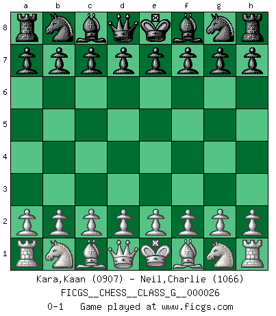 Last move : 0-1 2009 February 11 9:0:44 [Event "FICGS__CHESS__CLASS_G__000026"] [Site "FICGS"] [Date "2009.01.01"] [Round "1"] [White "Kara,Kaan"] [Black "Neil,Charlie"] [Result "0-1"] [WhiteElo "0907"] [BlackElo "1066"] 0-1 This chess game has been lost on time (started : 2009.01.01 20:33:10) Player Black won this chess game. Follow this game move after move (download)The Chess pieces are the block alphabet which shapes thoughts; and these thoughts, although making a visual design on the chessboard, express their beauty abstractly, like a poem. (Marcel Duchamp) Ich moechte nie einem Club beitreten, der Leute wie mich als Mitglieder aufnimmt. (Woody Allen) Cuando veas una buena jugada, trata de encontrar otra mejor. (Emanuel Lasker) Pour se monter efficace, un Cavalier a besoin d'avant-postes ! Les Cavaliers font les meilleurs bloqueurs de pions passés. True nature is revealed in times of difficulty. (Chinese proverb)
