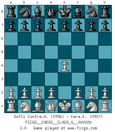 Last move : 1-0 2009 February 12 21:5:22 [Event "FICGS__CHESS__CLASS_G__000026"] [Site "FICGS"] [Date "2009.01.01"] [Round "1"] [White "Dotti Contra,Alessandro"] [Black "Kara,Kaan"] [Result "1-0"] [WhiteElo "0996"] [BlackElo "0907"] 1.e4 1-0 This chess game has been lost on time (started : 2009.01.01 20:33:10) King's pawn Opening Player White won this chess game. Follow this game move after move (download)Only the player with the initiative has the right to attack. (Wilhelm Steinitz) Es gibt keine einzige Frau, der ich nicht einen Springer vorgeben könnte und trotzdem gewänne. (Robert James Fischer) Tu sabes, camarada Pachman, no disfruto el ser un Ministro, preferería jugar al Ajedrez como tu. (Che Guevara) Lorsque vous vous retrouvez devant une position atroce, ne tendez pas un ultime piège dérisoire avec l'intention d'abandonner si l'adversaire le déjoue ! Faites-vous plutôt un devoir de résister comme si votre vie en dépendait. Jouez le coup qui vous déplairait au centuple si vous étiez dans la peau de votre tortionnaire ! Have no fear of perfection - you'll never reach it. (Salvador Dali)