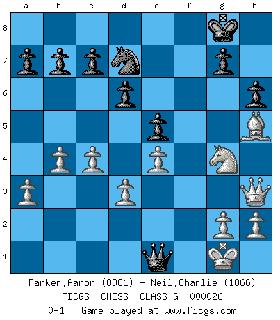Last move : 0-1 2009 February 2 0:39:11 [Event "FICGS__CHESS__CLASS_G__000026"] [Site "FICGS"] [Date "2009.01.01"] [Round "1"] [White "Parker,Aaron"] [Black "Neil,Charlie"] [Result "0-1"] [WhiteElo "0981"] [BlackElo "1066"] 1.e4 e5 2.Nf3 Nc6 3.a3 Nf6 4.d3 Bc5 5.Be3 Bxe3 6.fxe3 d6 7.Be2 Ng4 8.Qd2 O-O 9.Nc3 f5 10.exf5 Bxf5 11.O-O Be6 12.Ne4 Ne7 13.Nf2 Nf6 14.e4 Ng6 15.Ng5 Qe8 16.Nxe6 Qxe6 17.Qg5 h6 18.Qxg6 Rae8 19.c4 Nd7 20.Qg3 Nc5 21.Bd1 Rf6 22.b4 Nd7 23.Bg4 Qe7 24.Bh5 Ref8 25.Ng4 Rxf1+ 26.Rxf1 Rxf1+ 27.Kxf1 Qg5 28.Qh3 Qc1+ 29.Kf2 Qd2+ 30.Kg1 Qe1+ 0-1 King's pawn game Kingside Castling by player Black (move 8) Kingside Castling by player White (move 11) Player Black won this chess game. Follow this game move after move (download)Chess is like life. (Boris Spassky) Warum muß ich gegen diesen IDIOTEN verlieren? (Aaron Nimzowitsch) El Ajedrez moderno está demasiado preocupado con cosas como la estructura de Peones. Olvidenlo, el Jaque Mate termina la partida. (Nigel Short) Les échecs, c'est l'imagination. (David Bronstein) Home computers are being called upon to perform many new functions, including the consumption of homework formerly eaten by the dog. (Doug Larson)