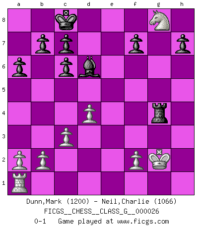 Last move : 0-1 2009 February 24 3:16:34 [Event "FICGS__CHESS__CLASS_G__000026"] [Site "FICGS"] [Date "2009.01.01"] [Round "1"] [White "Dunn,Mark"] [Black "Neil,Charlie"] [Result "0-1"] [WhiteElo "1200"] [BlackElo "1066"] 1.e4 e5 2.Nf3 Nc6 3.Bb5 a6 4.Bxc6 dxc6 5.Nxe5 Qd4 6.Nf3 Qxe4+ 7.Qe2 Qxe2+ 8.Kxe2 Bg4 9.Re1 O-O-O 10.Kf1 Nf6 11.d3 Bd6 12.Bg5 Bxf3 13.Bxf6 Bxg2+ 14.Kxg2 gxf6 15.Nc3 Rhg8+ 16.Kh1 Rg4 17.Ne4 Be5 18.Rg1 Rdg8 19.c3 R8g6 20.d4 Bxh2 21.Rxg4 Rxg4 22.Nxf6 Rh4 23.Ng8 Bd6 24.Kg2 Rg4+ 0-1 Ruy Lopez : Exchange variation Queenside Castling by player Black (move 9) Player Black won this chess game. Follow this game move after move (download)No one ever won a game by resigning. (Unknown) Es ist nicht das erste mal, dass sich die FIDE dem Arabischen Geld gebeugt hat (über die FIDE WM 2004 in Lybien). (Larry Evans) Las ideas audaces son como las piezas del Ajedrez que avanzan hacia adelante. Ellas pueden ser vencidas, pero también pueden iniciar una partida victoriosa. (Goethe) Les Echecs, c'est l'art de la guerre sans les charniers, c'est la résurrection des morts tombés au champ d'honneur, l'espoir perpétuel, la suprématie de l'intelligence sur la force, la culture de l'esprit. (F. Szpiner) The Movers & Shakers of this world are those who play chess in the mornings and go to the disco in the evenings. (Dinesh De Silva)