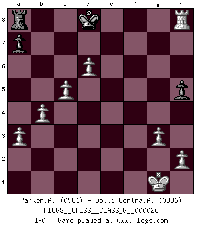 Last move : 1-0 2009 April 6 23:9:48 [Event "FICGS__CHESS__CLASS_G__000026"] [Site "FICGS"] [Date "2009.01.01"] [Round "1"] [White "Parker,Aaron"] [Black "Dotti Contra,Alessandro"] [Result "1-0"] [WhiteElo "0981"] [BlackElo "0996"] 1.e4 e5 2.Nf3 Nc6 3.a3 d5 4.exd5 e4 5.dxc6 exf3 6.Qxf3 bxc6 7.Qxc6+ Bd7 8.Qf3 Nf6 9.Qd1 Be7 10.Be2 O-O 11.Bf3 Rb8 12.Nc3 Bc5 13.O-O Re8 14.d4 Bb6 15.Bg5 Be6 16.d5 Bf5 17.Nb5 Bd7 18.Nd4 Bxd4 19.Qxd4 Bf5 20.c4 h6 21.Bh4 Rb6 22.b4 Rb7 23.Bxf6 Qxf6 24.Qxf6 gxf6 25.g3 Bd3 26.Rfc1 Be2 27.Bh1 Bd3 28.Rc3 Be4 29.Re3 f5 30.Bxe4 fxe4 31.Rae1 f5 32.f3 R7b8 33.fxe4 fxe4 34.Rxe4 Rxe4 35.Rxe4 Kg7 36.Re7+ Kf8 37.Rxc7 Ra8 38.d6 Ke8 39.c5 Kd8 40.Rh7 h5 41.Rh8+ 1-0 King's pawn game Kingside Castling by player Black (move 10) Kingside Castling by player White (move 13) Player White won this chess game. Follow this game move after move (download)Suddenly it was obvious to me in my analysis I had missed what Fischer had found with the greatest of ease at the board. (Mikhail Botvinnik) Die unerbitterlichsten Regeln im Schach sind die Ausnahmen. (Savielly Grigorievitsch Tartakower) El Ajedrez es 99 por ciento táctica. (Teichmann) Le jeu d'échecs est comme rejeté hors du temps. (Antoine de Saint-Exupéry) All men can see these tactics whereby I conquer, but what none can see is the strategy out of which victory is evolved. (Sun Tzu)