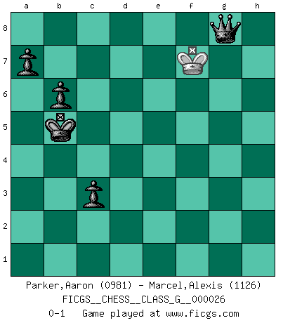 Last move : 0-1 2009 January 11 19:44:21 [Event "FICGS__CHESS__CLASS_G__000026"] [Site "FICGS"] [Date "2009.01.01"] [Round "1"] [White "Parker,Aaron"] [Black "Marcel,Alexis"] [Result "0-1"] [WhiteElo "0981"] [BlackElo "1126"] 1.e4 e5 2.Nf3 Nf6 3.d3 d6 4.Be2 Be7 5.Nh4 Nxe4 6.dxe4 Bxh4 7.Be3 Bg5 8.Bxg5 Qxg5 9.Bf3 Nc6 10.c3 O-O 11.Qd2 Qxd2+ 12.Nxd2 Be6 13.O-O Ne7 14.Rfe1 b6 15.a4 Rad8 16.c4 f5 17.exf5 Nxf5 18.Be4 Nd4 19.Bd3 Rf6 20.Re3 Rdf8 21.Rf1 g6 22.Ne4 Rf4 23.Ng5 Bd7 24.b4 Bf5 25.Bxf5 R4xf5 26.Ne4 Nc2 27.Rb3 Nd4 28.Rb2 Rf4 29.Re1 Nf5 30.Rc2 Nh4 31.Re3 Rg4 32.Ng3 Nf5 33.Nxf5 Rxf5 34.f3 Rd4 35.Re1 R5f4 36.Rec1 Kf8 37.b5 Ke7 38.h3 h5 39.Kh2 h4 40.Re1 Rxc4 41.Rxc4 Rxc4 42.Re4 Rxe4 43.fxe4 Ke6 44.Kg1 d5 45.exd5+ Kxd5 46.Kf2 Kd4 47.Kf3 e4+ 48.Kg4 e3 49.Kxh4 e2 50.g4 e1Q+ 51.Kg5 Kc4 52.Kxg6 Qh4 53.Kf5 Qxh3 54.Kf4 Kb4 55.g5 Kxa4 56.Ke5 Kxb5 57.Kf6 c5 58.g6 c4 59.g7 Qg4 60.Kf7 c3 61.g8Q Qxg8+ 0-1 Petrov's defense Kingside Castling by player Black (move 10) Kingside Castling by player White (move 13) Promotion Queen by player Black (move 50) 10 pieces endgame at move 52 : White KPPPP , Black KQPPP WHITE : King + 4 Pawns BLACK : King + 1 Queen 3 Pawns 9 pieces endgame at move 53 : White KPPP , Black KQPPP WHITE : King + 3 Pawns BLACK : King + 1 Queen 3 Pawns 8 pieces endgame at move 55 : White KPP , Black KQPPP WHITE : King + 2 Pawns BLACK : King + 1 Queen 3 Pawns 7 pieces endgame at move 56 : White KP , Black KQPPP WHITE : King + 1 Pawn BLACK : King + 1 Queen 3 Pawns Promotion Queen by player White (move 61) 6 pieces endgame at move 61 : White K , Black KQPPP WHITE : King + BLACK : King + 1 Queen 3 Pawns Player Black won this chess game. Follow this game move after move (download)You cannot play at Chess if you are kind-hearted. (French Proverb) Heutzutage gewinnt im Turnier nicht derjenige Spieler, der weitreichende Pläne entwirft, sondern einfach jener, der Zug um Zug kämpft. (David Bronstein) Yo no le temo a Spassky. Todos saben que yo soy el mejor. Uno no necesita un torneo para probarlo. (Bobby Fischer) Que feriez-vous si vous étiez en train de jouer aux échecs et que la fin du monde arrive ? Je continuerais à jouer. (Saint Borromée) Begin at the beginning and go on till you come to the end; then stop. (Lewis Carrol, Alice in Wonderland)