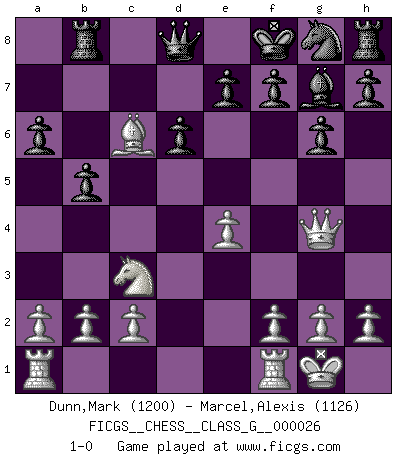 Last move : 1-0 2009 February 2 8:30:0 [Event "FICGS__CHESS__CLASS_G__000026"] [Site "FICGS"] [Date "2009.01.01"] [Round "1"] [White "Dunn,Mark"] [Black "Marcel,Alexis"] [Result "1-0"] [WhiteElo "1200"] [BlackElo "1126"] 1.e4 c5 2.Nc3 Nc6 3.Nf3 d6 4.Bc4 g6 5.O-O Bg7 6.d3 Bd7 7.Be3 a6 8.d4 cxd4 9.Bxd4 Nxd4 10.Nxd4 b5 11.Bd5 Rb8 12.Nc6 Bxc6 13.Bxc6+ Kf8 14.Qg4 1-0 Sicilian : Closed, 2...Nc6 Kingside Castling by player White (move 5) Player White won this chess game. Follow this game move after move (download)One bad move nullifies forty good ones. (Horowitz) Frage des Reporters: -Welche besonderen Umstände rechtfertigen das Anhalten der Uhren während einer Turnierpartie? Antwort: -Einen Fotographen zu strangulieren. (Siegbert Tarrasch) Al jugar al Ajedrez entonces, podemos aprender: Primero: Previsión... Segundo: Prudencia... Tercero: Cautela... Y al final, aprendemos del Ajedrez el hábito de no ser desanimados por apariencias malas presentes en el estado de nuestros asuntos, el hábito de la esperanza por una oportunidad favorable y la perseveración de los secretos de los recursos. (Benjamin Franklin) La guerre est enfant de la passion, la passion est enfant du narcissisme et le narcissisme est l'enfant. (...) Une autre partie ? (Thibault de Vassal) You can't play chess if you're groggy from pills. (Anatoly Karpov)