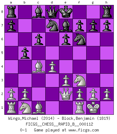 Last move : 0-1 2009 March 29 0:19:53 [Event "FICGS__CHESS__RAPID_B__000112"] [Site "FICGS"] [Date "2009.01.02"] [Round "1"] [White "Wingo,Michael"] [Black "Block,Benjamin"] [Result "0-1"] [WhiteElo "2014"] [BlackElo "1819"] 1.d4 d5 2.c4 c6 3.Nf3 Nf6 4.e3 e6 5.Bd3 dxc4 6.Bxc4 Nbd7 7.O-O Be7 8.Qe2 b5 0-1 This chess game has been lost on time (started : 2009.01.02 20:46:42) QGD Slav : 4.e3 Kingside Castling by player White (move 7) Player Black won this chess game. Follow this game move after move (download)Any material change in a position must come about by mate, a capture, or a Pawn promotion. (Purdy) Es hat in meinem Leben Zeiten gegeben, da ich sehr nahe daran war zu glauben, daß ich auch nicht eine einzige Schachpartie verlieren könnte. (José Raúl Capablanca) En manos de Fischer's, una diminuta ventaja teórica es tan buena como tener una Reina de ventaja. (Isaac Kashdan) Il vaut toujours mieux jouer un plan faux de façon logique que de n'avoir pas de plan du tout. (Victor Kortchnoï) Those parts of the system that you can hit with a hammer (not advised) are called hardware; those program instructions that you can only curse at are called software. (Anonymous)