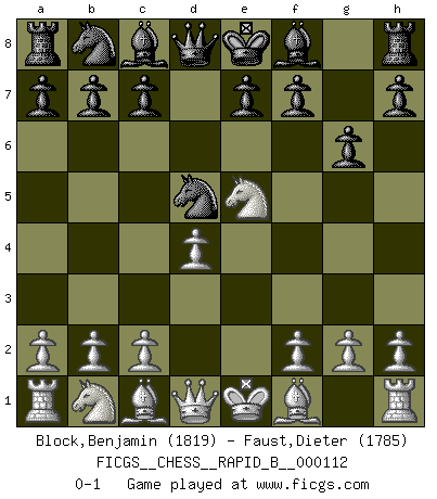 Last move : 0-1 2009 February 20 21:30:5 [Event "FICGS__CHESS__RAPID_B__000112"] [Site "FICGS"] [Date "2009.01.02"] [Round "1"] [White "Block,Benjamin"] [Black "Faust,Dieter"] [Result "0-1"] [WhiteElo "1819"] [BlackElo "1785"] 1.e4 Nf6 2.e5 Nd5 3.d4 d6 4.Nf3 dxe5 5.Nxe5 g6 0-1 This chess game has been lost on time (started : 2009.01.02 20:46:42) Alekhine's defense : Modern, Larsen variation Player Black won this chess game. Follow this game move after move (download)There are two types of sacrifices: correct ones and mine. (Mikhail Tal) Wenn sie aufgeben, dann danke ich Ihnen für das Spiel (Eventualzug beim Fernschach). (Anonymous) El Ajedrez no es como la vida... ¡tiene reglas!. (Mark Pasternak) Les échecs sont plus proches de l'art de l'assassinat que de l'art de la guerre. (Arturo Perez-Reverte) Watch your thoughts; they become words. Watch your words; they become actions. Watch your actions; they become habits. Watch your habits; they become character. Watch your character; it becomes your destiny. (Frank Outlaw)