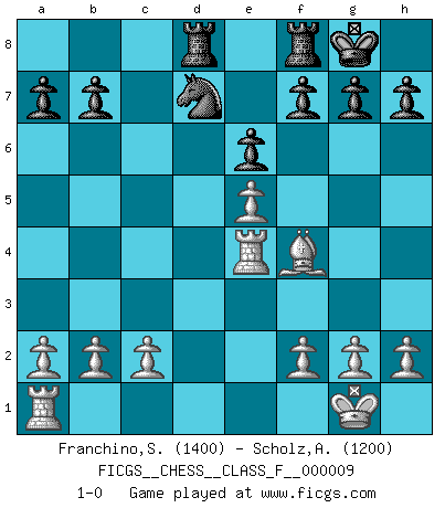 Last move : 1-0 2006 September 11 15:47:21 [Event "FICGS__CHESS__CLASS_F__000009"] [Site "FICGS"] [Date "2006.08.23"] [Round "1"] [White "Franchino,Sebastian"] [Black "Scholz,Andreas"] [Result "1-0"] [WhiteElo "1400"] [BlackElo "1200"] 1.e4 e6 2.d4 c6 3.Nf3 d5 4.exd5 cxd5 5.Bb5 Bd7 6.Bxd7 Qxd7 7.O-O Bd6 8.Nc3 Nf6 9.Ne5 Bxe5 10.dxe5 Ne4 11.Nxe4 dxe4 12.Qxd7 Nxd7 13.Bf4 O-O 14.Rfe1 Rad8 15.Rxe4 1-0 French defense Kingside Castling by player White (move 7) Kingside Castling by player Black (move 13) Player White won this chess game. Follow this game move after move (download)I thought the most common mistake [in chess] was the first one: Learning the game :P (Garvin Gray, FICGS forum) Als er Schachweltmeister wurde ließ er praktisch alle stärksten Sovietspieler für sich arbeiten. Wenn ein auch nur mittelmässiger Meister ein Spezialist für eine bestimmte Eröffnung war, wurde er von Karpov gerufen. Das wurde alles geheim gehalten. (Mikhail Moiseyevich Botvinik) El Ajedrez es un cuento de Hadas de las 1001 metidas de pata. (Savielly Tartakower) A chaque perte on perd un peu de soi. (Joël Lautier) Computers make it easier to do a lot of things, but most of the things they make it easier to do don't need to be done. (Andy Rooney)