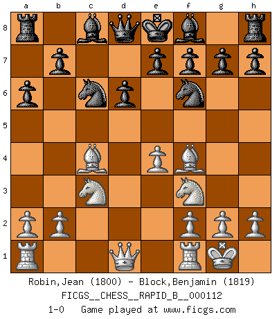 Last move : 1-0 2009 February 24 9:40:29 [Event "FICGS__CHESS__RAPID_B__000112"] [Site "FICGS"] [Date "2009.01.02"] [Round "1"] [White "Robin,Jean"] [Black "Block,Benjamin"] [Result "1-0"] [WhiteElo "1800"] [BlackElo "1819"] 1.e4 c5 2.d4 cxd4 3.c3 dxc3 4.Nxc3 Nc6 5.Nf3 d6 6.Bc4 a6 7.O-O Nf6 8.Bf4 1-0 This chess game has been lost on time (started : 2009.01.02 20:46:42) Sicilian : Smith-Morra gambit Kingside Castling by player White (move 7) Player White won this chess game. Follow this game move after move (download)There are tough players and nice guys, and I'm a tough player. (Bobby Fischer) Der beste Spieler in einem Turnier gewinnt es nie. Er landet auf Platz zwei oder drei. (Siegbert Tarrasch) Si yo gano un torneo, yo lo gano por mí mismo. Yo hago las jugadas. Nadie me ayuda. (Bobby Fischer) Les échecs, c'est l'imagination. (David Bronstein) If we knew what we were doing, we would not call it research. (Albert Einstein)