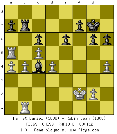 Last move : 1-0 2009 April 10 23:25:57 [Event "FICGS__CHESS__RAPID_B__000112"] [Site "FICGS"] [Date "2009.01.02"] [Round "1"] [White "Parmet,Daniel"] [Black "Robin,Jean"] [Result "1-0"] [WhiteElo "1698"] [BlackElo "1800"] 1.e4 d6 2.d4 Nf6 3.Nc3 g6 4.f4 Bg7 5.Nf3 O-O 6.Bd3 Nc6 7.e5 dxe5 8.fxe5 Nd5 9.Nxd5 Qxd5 10.c3 Bg4 11.Qe2 Rad8 12.Be4 Qd7 13.h3 Be6 14.O-O Na5 15.b3 c5 16.dxc5 Qc7 17.Be3 Bxe5 18.Nxe5 Qxe5 19.Bd4 Qc7 20.Rae1 Nc6 21.Bxc6 bxc6 22.Qe3 Rd5 23.Qh6 Rxd4 24.cxd4 Bd5 25.h4 Qg3 26.Qg5 Qc3 27.Qe3 Qxe3+ 28.Rxe3 e6 29.b4 Rb8 30.Ra3 Rb7 31.Rb1 Bc4 32.Kf2 h6 33.Ra5 Kg7 34.a4 1-0 Pirc : Austrian attack, 6.Bd3 Kingside Castling by player Black (move 5) Kingside Castling by player White (move 14) Player White won this chess game. Follow this game move after move (download)It is peculiar but a fact nevertheless, that gamblers in chess always have enthusiastic followers. (Botvinnik) Ich glaube, ich kenne inzwischen die Gründe für mein Versagen: schachliche Charakterfehler. Ich war nie ein Wunderkind und in meiner gesamten menschlichen Entwicklung immer zu langsam. (Viktor Kortschnoi) Si el ingenio solamente fuese necesario para lucirse, las mujeres serían las mejores jugadoras de Ajedrez del mundo. (Albin) Fischer est le meilleur joueur du monde et Karpov n'est qu'un joueur de bistrot. (Garry Kasparov, agé de 16 ans) There is a great deal of difference between an eager man who wants to read a book and a tired man who wants a book to read. (G.K. Chesterton)