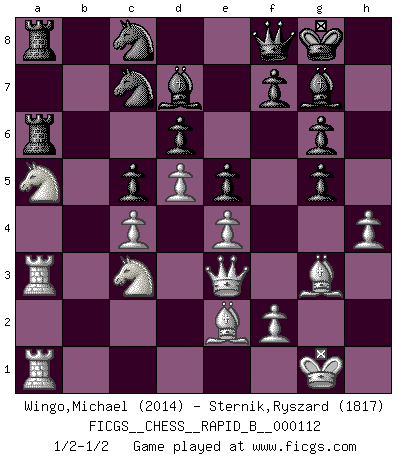 Last move : 1/2-1/2 2009 March 12 3:24:31 [Event "FICGS__CHESS__RAPID_B__000112"] [Site "FICGS"] [Date "2009.01.02"] [Round "1"] [White "Wingo,Michael"] [Black "Sternik,Ryszard"] [Result "1/2-1/2"] [WhiteElo "2014"] [BlackElo "1817"] 1.d4 Nf6 2.c4 g6 3.Nc3 Bg7 4.e4 d6 5.Nf3 O-O 6.h3 e5 7.d5 Na6 8.Bg5 Qe8 9.g4 Nc5 10.Nd2 a5 11.Qf3 Qe7 12.Be2 a4 13.Qe3 Bd7 14.O-O Na6 15.Rab1 Rfb8 16.b4 axb3 17.Nxb3 Nb4 18.Rb2 c5 19.Ra1 Qf8 20.a3 Na6 21.Nd2 h6 22.Bh4 Nc7 23.Rb3 Bc8 24.Rab1 Nd7 25.Bg3 Ra5 26.h4 Rba8 27.Ra1 R5a6 28.a4 Nb6 29.Rba3 Bd7 30.a5 Nc8 31.g5 b6 32.Nb3 bxa5 33.Nxa5 hxg5 1/2-1/2 King's Indian : 5.Nf3 Kingside Castling by player Black (move 5) Kingside Castling by player White (move 14) This chess game ended in a draw. Follow this game move after move (download)A passed Pawn increases in strength as the number of pieces on the board diminishes. (Capablanca) Ich bin stolz ein Bulgare zu sein. (Veselin Topalov) Entre mas años cumplo, mas valoro los Peones. (Keres) Aidez vos pièces, elles vous aideront. (Paul Morphy) A good programmer is someone who always looks both ways before crossing a one-way street. (Doug Linder)