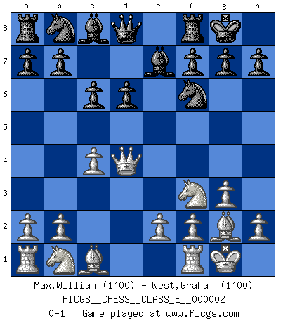 Last move : 0-1 2006 June 10 22:9:34 [Event "FICGS__CHESS__CLASS_E__000002"] [Site "FICGS"] [Date "2006.04.15"] [Round "1"] [White "Max,William"] [Black "West,Graham"] [Result "0-1"] [WhiteElo "1400"] [BlackElo "1400"] 1.c4 e5 2.g3 Nf6 3.Bg2 c6 4.d4 exd4 5.Qxd4 Be7 6.Nf3 O-O 7.O-O d6 0-1 This chess game has been lost on time (started : 2006.04.15 20:18:24) English Opening Kingside Castling by player Black (move 6) Kingside Castling by player White (move 7) Player Black won this chess game. Follow this game move after move (download)A Chess game is divided into three stages: the first, when you hope you have the advantage, the second when you believe you have an advantage, and the third... when you know you're going to lose ! (Savielly Tartakower) Konzentriere dich auf materielle Gewinne. Nimm, was dir dein Gegner gibt, ausser es gibt einen guten Grund der dagegenspricht. (Robert James Fischer) Estaba muy claro de que el punto vulnerable del Gran Maestro Americano (Bobby Fischer) radicaba en las posiciones de doble filo, colgantes, irracionales, donde el siempre falló en encontrar un triunfo aún en una posición de clara victoria. (Efim Geller) La guerre est enfant de la passion, la passion est enfant du narcissisme et le narcissisme est l'enfant. (...) Une autre partie ? (Thibault de Vassal) There is no vagueness without wind. (Chinese proverb)