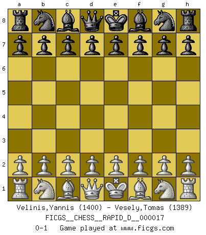 Last move : 0-1 2009 February 2 20:26:16 [Event "FICGS__CHESS__RAPID_D__000017"] [Site "FICGS"] [Date "2009.01.03"] [Round "1"] [White "Velinis,Yannis"] [Black "Vesely,Tomas"] [Result "0-1"] [WhiteElo "1400"] [BlackElo "1389"] 0-1 This chess game has been lost on time (started : 2009.01.03 0:10:48) Player Black won this chess game. Follow this game move after move (download)When you play Bobby, it is not a question if you win or lose. It is a question if you survive. (Boris Spassky) Wenn Capablanka heute auf der Schachbühne erscheinen würde, hätte er ein halbes Jahr gebraucht um sich die Schachtheorie anzueignen. Und dann hätte er alles und jeden besiegt. (Mikhail Moiseyevich Botvinik) En el Ajedrez, cuando menos, el valiente hereda la tierra. (Edmar Mednis) Psychologiquement, tu dois avoir confiance en toi même, mais cette confiance doit être basée sur des faits. (Robert Fischer) Do you know these so called Volunteers don't even get paid! (Simpsons)