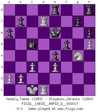 Last move : 0-1 2009 January 6 19:1:19 [Event "FICGS__CHESS__RAPID_D__000017"] [Site "FICGS"] [Date "2009.01.03"] [Round "1"] [White "Vesely,Tomas"] [Black "Stoyanov,Zdravko"] [Result "0-1"] [WhiteElo "1389"] [BlackElo "1364"] 1.e4 c6 2.d4 d6 3.Nf3 Bg4 4.Be2 Nd7 5.Nc3 e5 6.d5 h6 7.h3 Bh5 8.g4 Bg6 9.h4 Be7 10.h5 Bh7 11.Be3 Ngf6 12.Qd2 Nxg4 13.Rg1 Nxe3 14.Qxe3 Bf6 15.O-O-O Nb6 16.Bd3 cxd5 17.Bb5+ Kf8 18.Nxd5 Nxd5 19.Rxd5 a6 20.Be2 Qc7 21.Rgd1 Rc8 22.c3 Be7 23.Nh2 Bg5 24.Rxd6 Bxe3+ 25.fxe3 Bxe4 26.Bf3 Bxf3 27.Nxf3 e4 28.Ne5 Re8 29.Nd7+ Ke7 30.Ne5 Qc5 31.Rd7+ Ke6 32.Ng4 f5 0-1 Caro-Kann defense Queenside Castling by player White (move 15) Player Black won this chess game. Follow this game move after move (download)Could we look into the head of a Chess player, we should see there a whole world of feelings, images, ideas, emotion and passion. (Alfred Binet) Matt entspricht nicht immer den Tatsachen. (Savielly Grigorievitsch Tartakower) Preferería tener un Peón que un dedo. (Reuben Fine) Botvinnik disait en comparant les échecs à la musique: Il existe une science dont le but est l'étude de l'acoustique et des sons. Mais il y a aussi un art qui se sert de l'océan des sons : c'est la musique. De toute évidence, il en est de même pour la pensée. La logique est l'étude des lois de la réflexion et les échecs reflètent, en tant qu'art, le côté logique de la réflexion, sous la forme d'images artistiques... Extrait de Fischer - Spassky, Reykjavik 1972 par Alexander & F. Wyndham (Ed. Solar), p 37. Quotation,n.: The act of repeating erroneously the words of another. The words erroneously repeated. (Ambrose Bierce, The Devil's Dictionary)