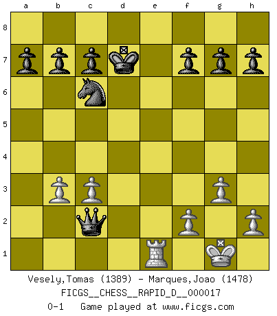 Last move : 0-1 2009 February 11 17:12:51 [Event "FICGS__CHESS__RAPID_D__000017"] [Site "FICGS"] [Date "2009.01.03"] [Round "1"] [White "Vesely,Tomas"] [Black "Marques,Joao"] [Result "0-1"] [WhiteElo "1389"] [BlackElo "1478"] 1.e4 e5 2.Bc4 Nf6 3.Nc3 Be7 4.Nf3 Nc6 5.d4 exd4 6.Nxd4 O-O 7.O-O Bb4 8.Nf5 Bxc3 9.bxc3 Nxe4 10.Qg4 Qf6 11.Qxe4 d5 12.Bxd5 Bxf5 13.Qf4 Bxc2 14.Ba3 Qxf4 15.Bxf8 Kxf8 16.Rfe1 Re8 17.Rxe8+ Kxe8 18.Re1+ Kd7 19.g3 Qf5 20.Bb3 Bxb3 21.axb3 Qc2 0-1 Bishop's Opening : Berlin defense Kingside Castling by player Black (move 6) Kingside Castling by player White (move 7) Player Black won this chess game. Follow this game move after move (download)Fischer, who may or may not be mad as a hatter, has every right to be horrified. (Jeremy Silman) Darum geht es im Schach. Einen Tag gibst du deinem Gegner eine Lektion, am nächsten Tag gibt er dir eine. (Robert James Fischer) El Ajedrez es una guerra en un tablero. El objetivo es aplastar la mente del oponente. (Bobby Fischer) On entre au jeu d'Echecs comme on entre en Religion. Pour le joueur d'Echecs, la partie d'Echecs c'est l'office, la messe, le défilé du 1er Mai, le dépôt de gerbe au Monument aux Morts. C'est un drame sacré. (Michel Roos) Computers are like Old Testament gods; lots of rules and no mercy. (Joseph Campbell)