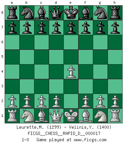 Last move : 1-0 2009 February 3 8:29:39 [Event "FICGS__CHESS__RAPID_D__000017"] [Site "FICGS"] [Date "2009.01.03"] [Round "1"] [White "Leurette,Marc-Antoine"] [Black "Velinis,Yannis"] [Result "1-0"] [WhiteElo "1299"] [BlackElo "1400"] 1.e4 1-0 This chess game has been lost on time (started : 2009.01.03 0:10:48) King's pawn Opening Player White won this chess game. Follow this game move after move (download)Combinations have always been the most intriguing aspect of Chess. The masters look for them, the public applauds them, the critics praise them. It is because combinations are possible that Chess is more than a lifeless mathematical exercise. They are the poetry of the game; they are to Chess what melody is to music. They represent the triumph of mind over matter. (Reuben Fine) Oft bringt ein stiller Zug das Erdbeben. (Richard Reti) Entre mas años cumplo, mas valoro los Peones. (Keres) Ce n'est pas pour s'amuser qu'il joue aux échecs : il célèbre un culte. (Vladimir Nabokov) Wisdom doesn't necessarily come with age. Sometimes age just shows up all by itself. (Tom Watson)