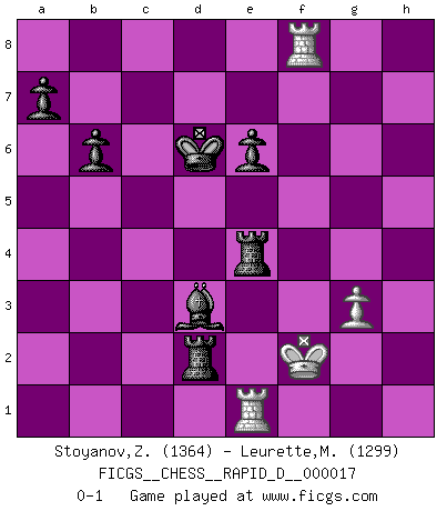 Last move : 0-1 2009 January 10 20:40:8 [Event "FICGS__CHESS__RAPID_D__000017"] [Site "FICGS"] [Date "2009.01.03"] [Round "1"] [White "Stoyanov,Zdravko"] [Black "Leurette,Marc-Antoine"] [Result "0-1"] [WhiteElo "1364"] [BlackElo "1299"] 1.e4 e5 2.Nf3 Nc6 3.Bb5 Nf6 4.d3 Bc5 5.Bxc6 dxc6 6.c3 O-O 7.Nxe5 Bd6 8.Nf3 b6 9.h3 Qe8 10.O-O Ba6 11.Re1 Nd7 12.d4 c5 13.b3 cxd4 14.Qxd4 Bc5 15.Qd2 Rd8 16.Qf4 Bd6 17.Qg4 Ne5 18.Nxe5 Bxe5 19.Bh6 Qe6 20.Qxe6 fxe6 21.Bg5 Rd7 22.Nd2 Bxc3 23.Rad1 h6 24.Be3 Rfd8 25.Bf4 Bxd2 26.Bxd2 Rxd2 27.Rc1 c5 28.Ra1 c4 29.bxc4 Bxc4 30.a4 R8d4 31.e5 Kf7 32.g3 Kg6 33.h4 Kf5 34.Rac1 Be2 35.Kg2 Rxa4 36.Rc7 g5 37.hxg5 hxg5 38.Rf7+ Kxe5 39.f3 Kd6 40.Rf6 Bc4 41.Kh3 Be2 42.Kg2 g4 43.fxg4 Rxg4 44.Kf2 Re4 45.Rf8 Bd3 0-1 Ruy Lopez : Berlin defense Kingside Castling by player Black (move 6) Kingside Castling by player White (move 10) Player Black won this chess game. Follow this game move after move (download)No other master has such a terrific will to win. At the board he radiates danger, and even the strongest opponents tend to freeze, like rabbits when they smell a panther. Even his weaknesses are dangerous. As white, his opening game is predictable - you can make plans against it - but so strong that your plans almost never work. In the middle game his precision and invention are fabulous, and in the end game you simply cannot beat him. (Anonymous German Expert) Frage des Reporters: -Welche besonderen Umstände rechtfertigen das Anhalten der Uhren während einer Turnierpartie? Antwort: -Einen Fotographen zu strangulieren. (Siegbert Tarrasch) Un jugador que es sorprendido, esta derrotado a medias. (Proverbio) Le succès, c'est être capable d'aller d'échec en échec sans perdre son enthousiasme. (Winston Churchill) Good decisions come from experience, and experience comes from bad decisions. (Anonymous)